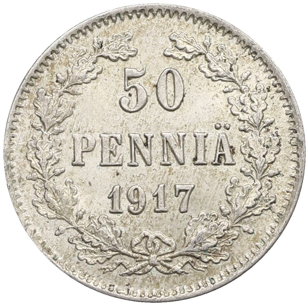 Монета 50 пенни 1917 года Русская Финляндия — Орел без корон (Временное правительство) (Артикул: K10-2645): подробные характеристики, качественные фотографии в высоком разрешении, низкая цена.