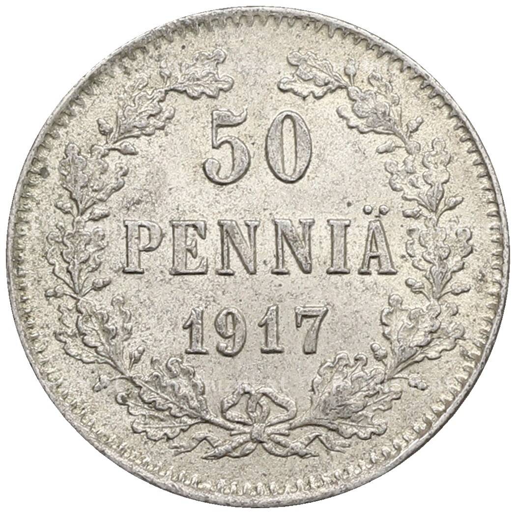Монета 50 пенни 1917 года Русская Финляндия — Орел без корон (Временное правительство) (Артикул: K10-2653): подробные характеристики, качественные фотографии в высоком разрешении, низкая цена.