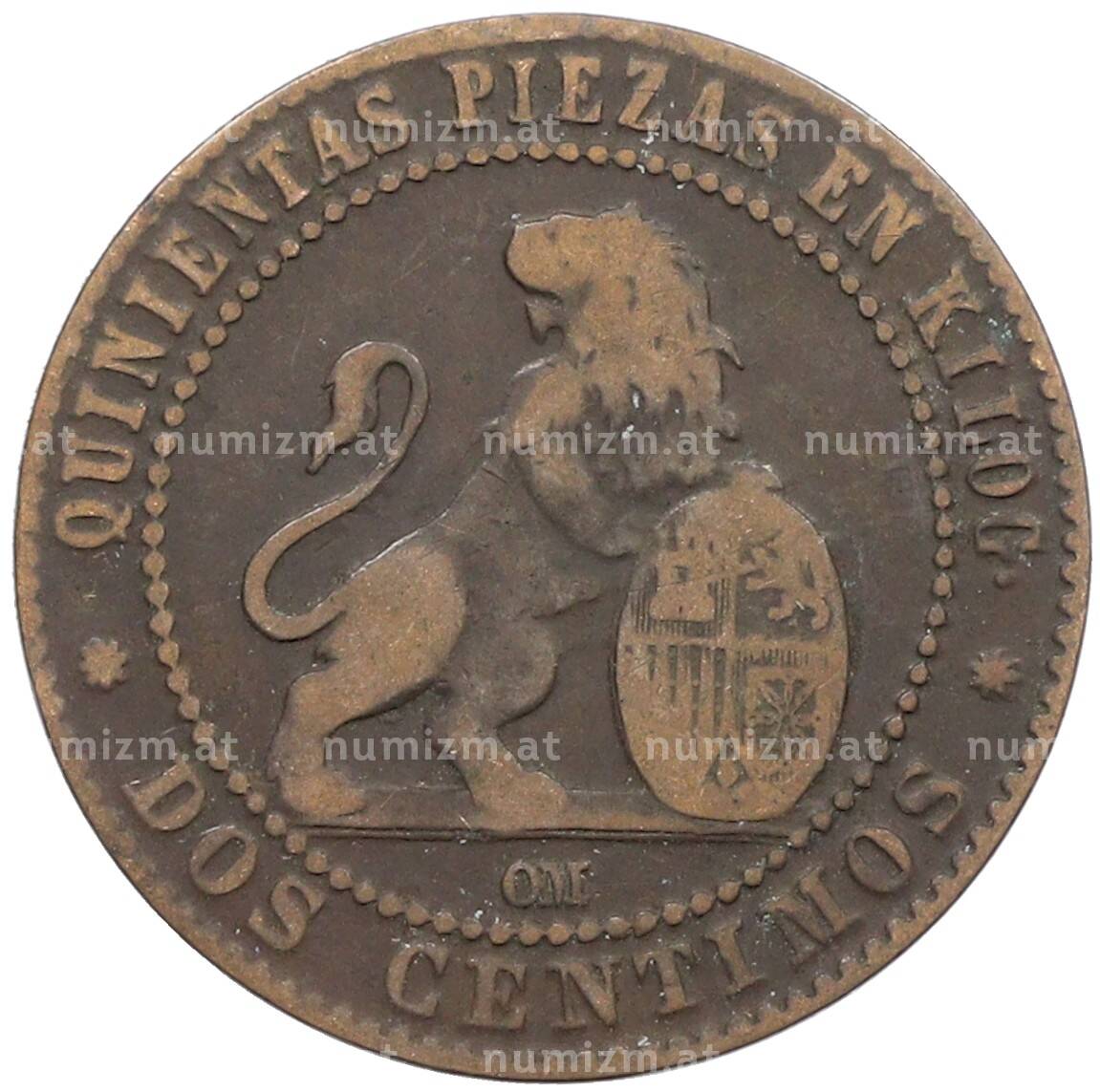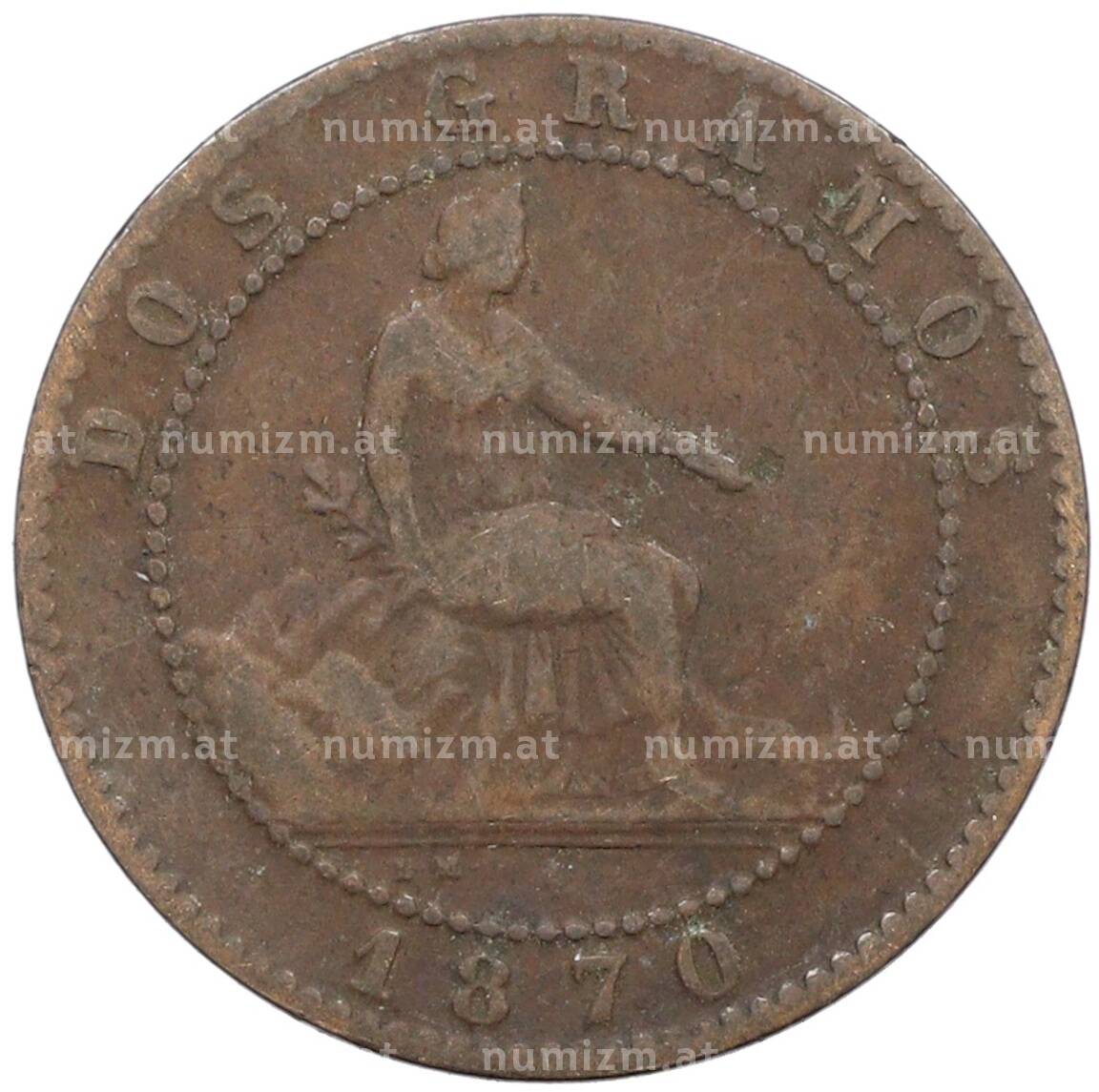 Интернет магазин «Нумизмат» предлагает приобрести 2 сентимо 1870 года Испания.