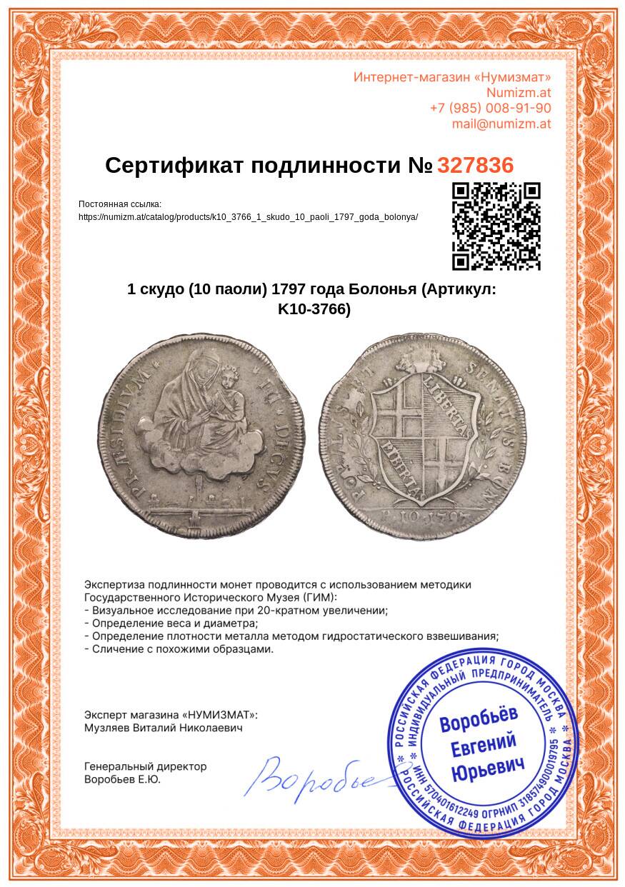 20.01.2025Интернет магазин «Нумизмат» предлагает приобрести 1 скудо (10 паоли) 1797 года Болонья.