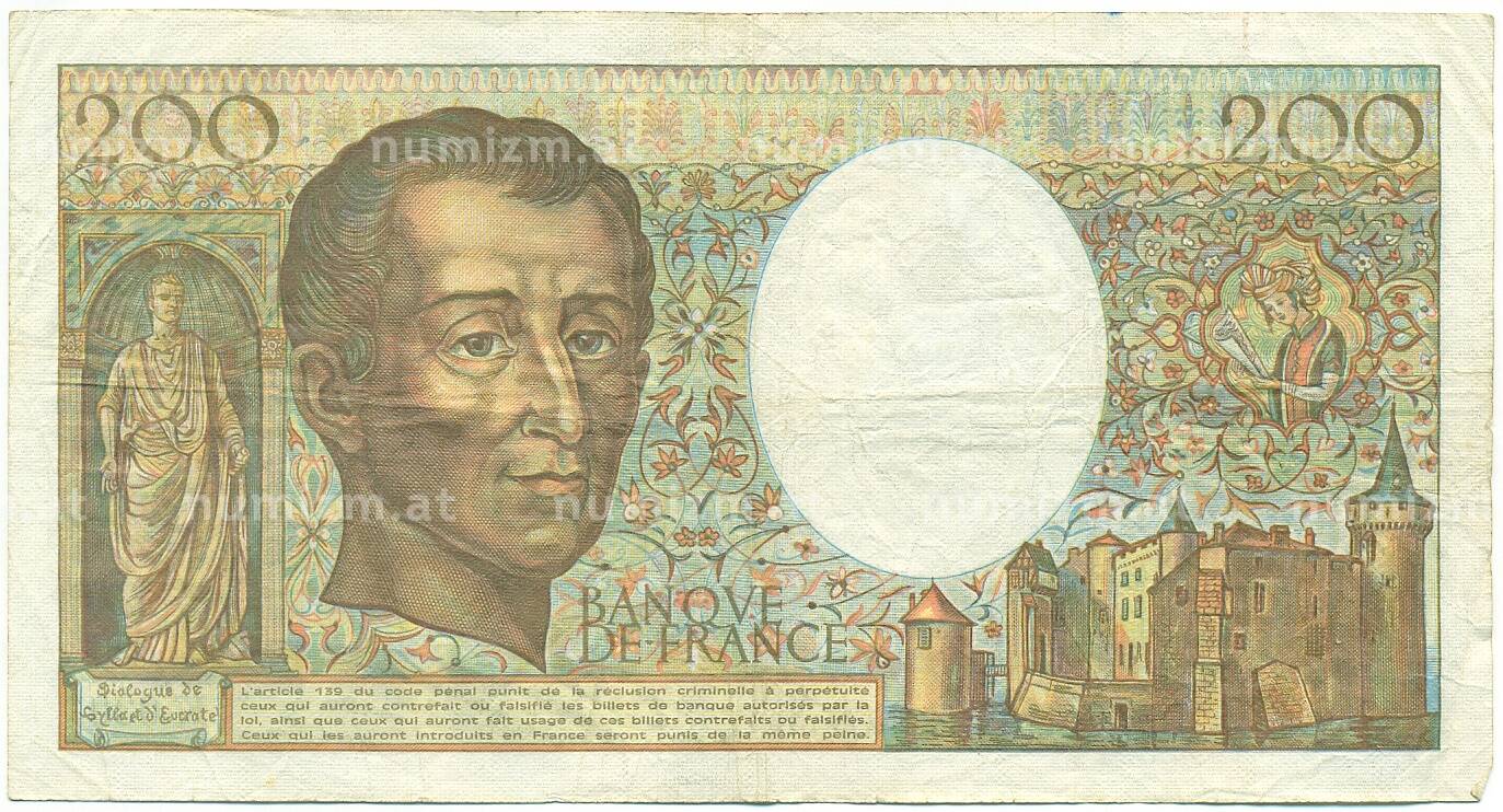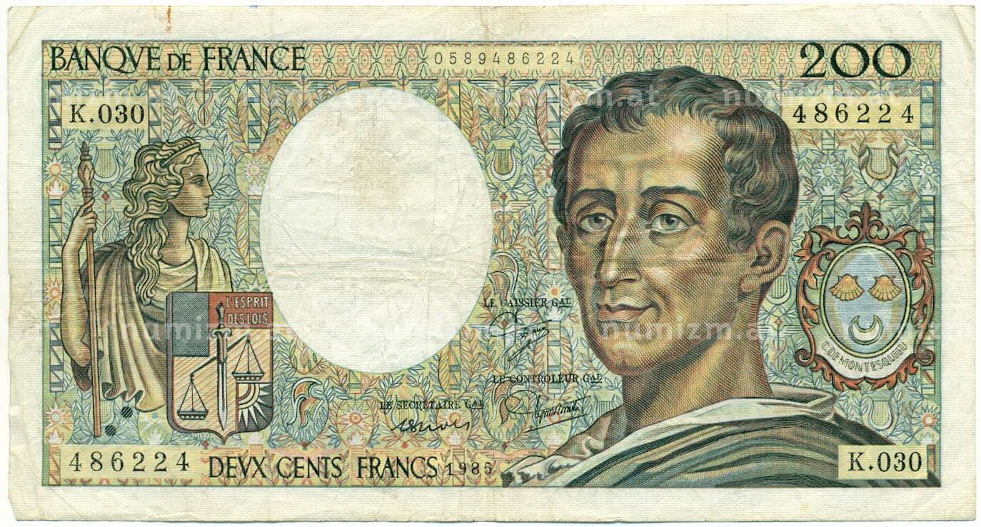 Банкнота 200 франков 1985 года Франция (Артикул: K10-3878): подробные характеристики, качественные фотографии в высоком разрешении, низкая цена.