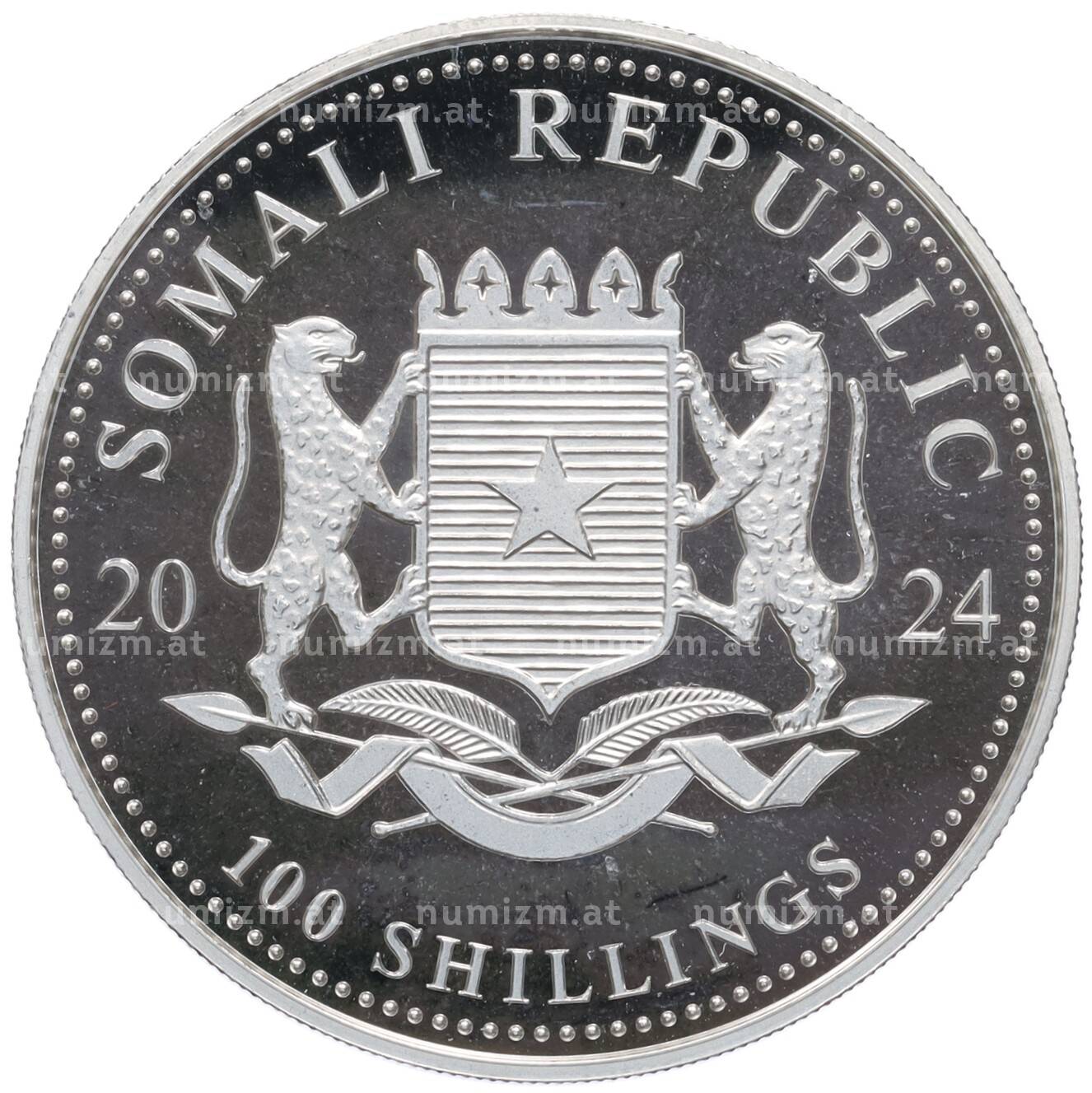20.01.2025Интернет магазин «Нумизмат» предлагает приобрести 100 шиллингов 2024 года Сомали «Дикая природа Африки — Слон».