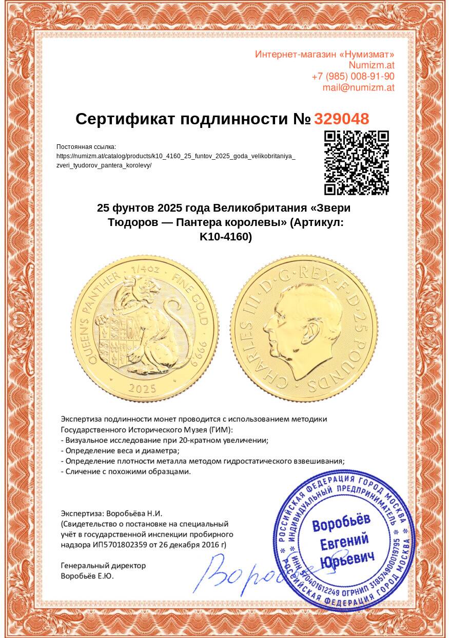 20.01.2025Интернет магазин «Нумизмат» предлагает приобрести 25 фунтов 2025 года Великобритания «Звери Тюдоров — Пантера королевы».