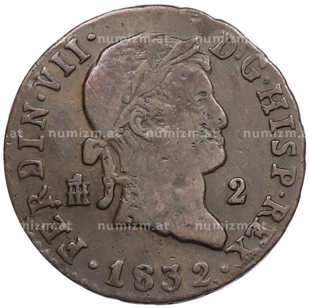 Купить 2 мараведи 1832 года Испания по привлекательной цене можно в нашем интернет-магазине — Вам достаточно оформить заказ на сайте. Все монеты, представленные в каталоге, находятся в наличии на нашем складе.