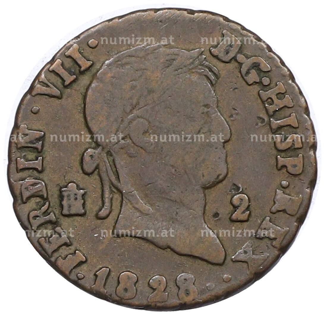 Купить 2 мараведи 1828 года Испания по привлекательной цене можно в нашем интернет-магазине — Вам достаточно оформить заказ на сайте. Все монеты, представленные в каталоге, находятся в наличии на нашем складе.