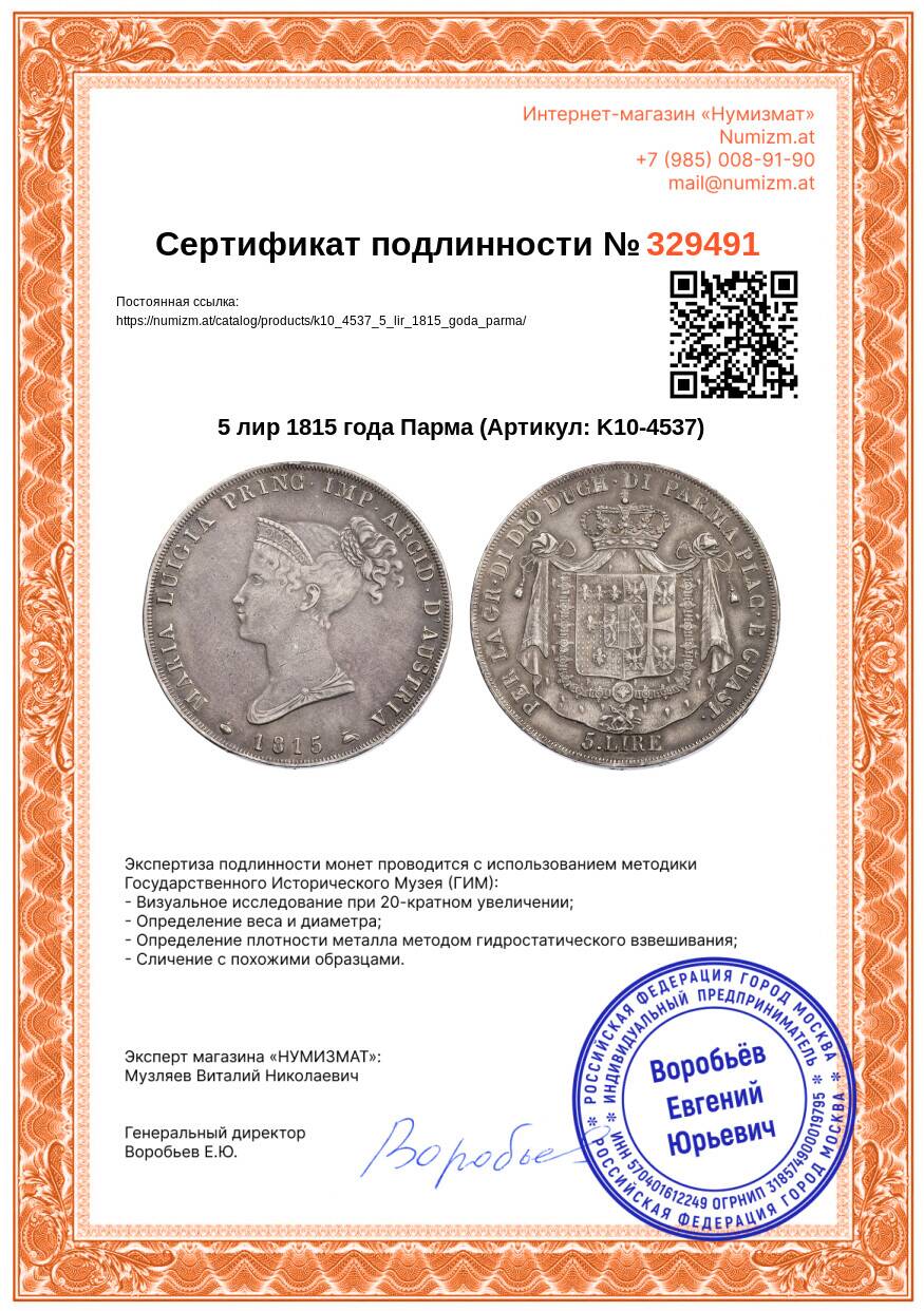 Купить 5 лир 1815 года Парма по привлекательной цене можно в нашем интернет-магазине — Вам достаточно оформить заказ на сайте. Все монеты, представленные в каталоге, находятся в наличии на нашем складе.