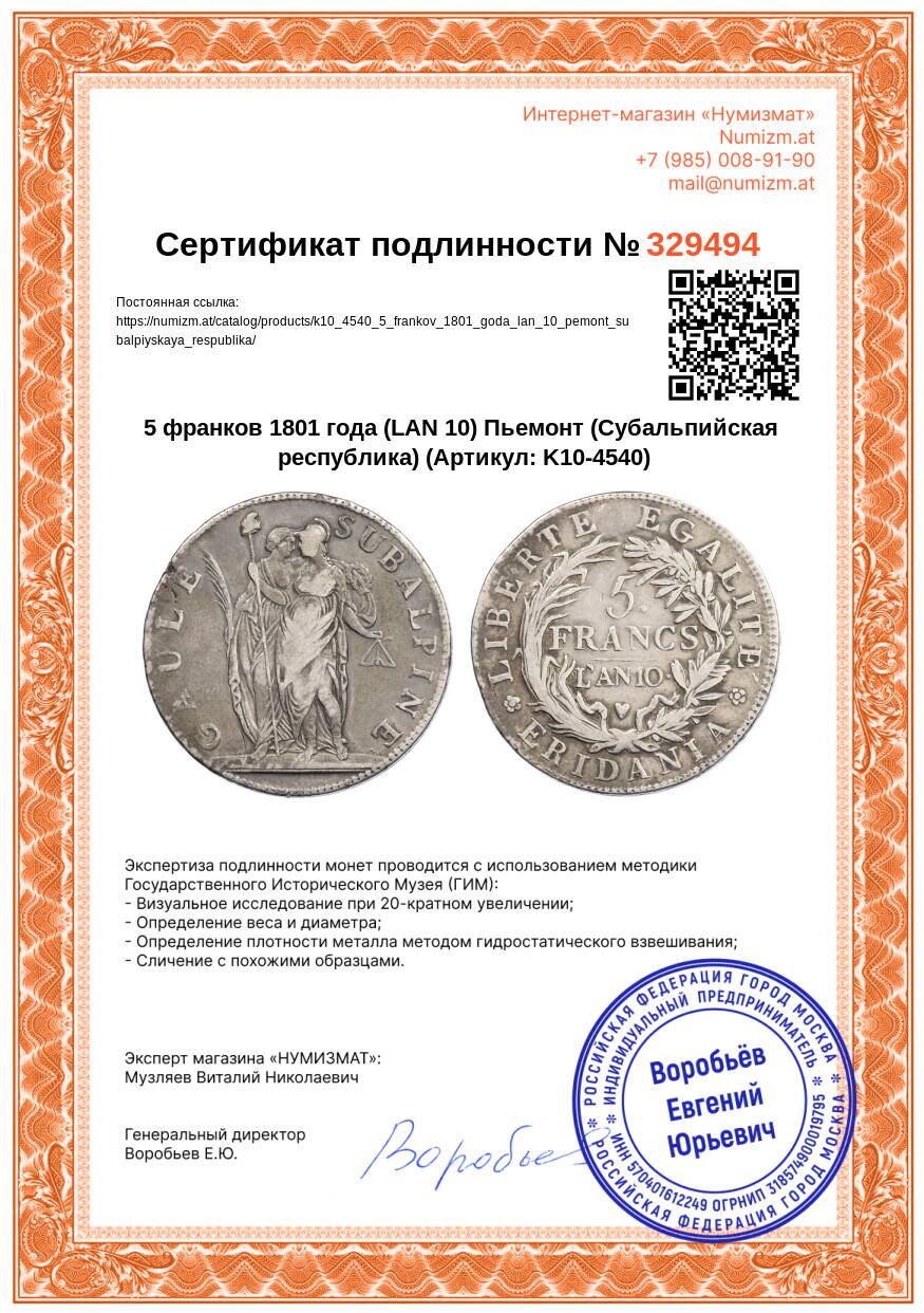 20.01.2025Интернет магазин «Нумизмат» предлагает приобрести 5 франков 1801 года (LAN 10) Пьемонт (Субальпийская республика).