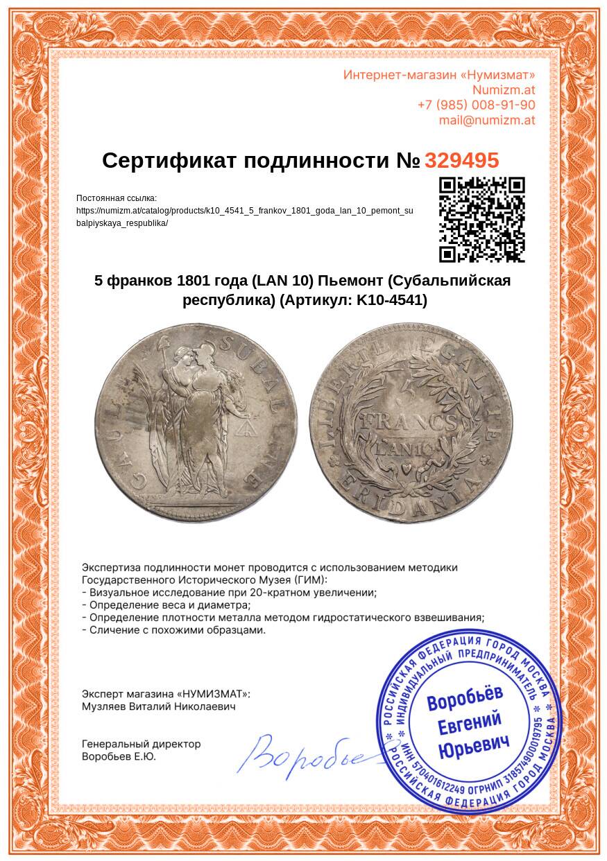 20.01.2025Интернет магазин «Нумизмат» предлагает приобрести 5 франков 1801 года (LAN 10) Пьемонт (Субальпийская республика).