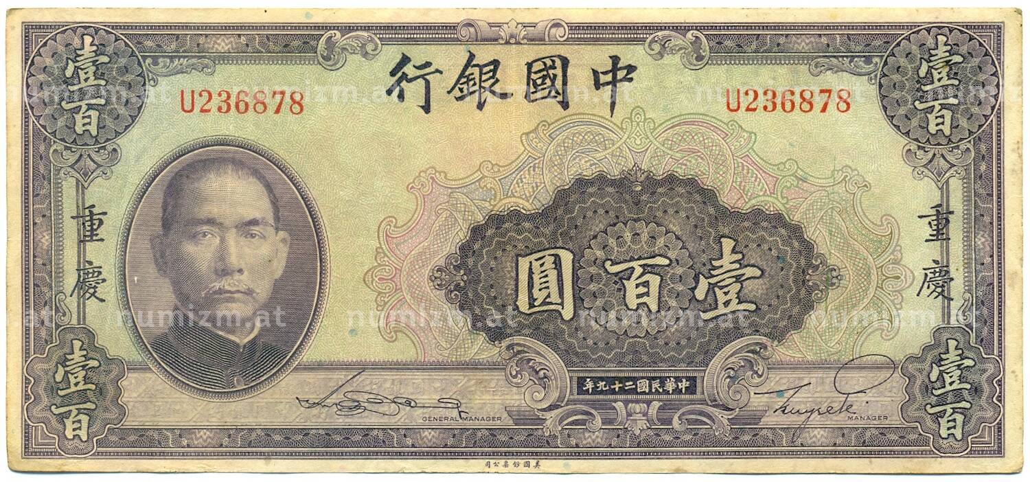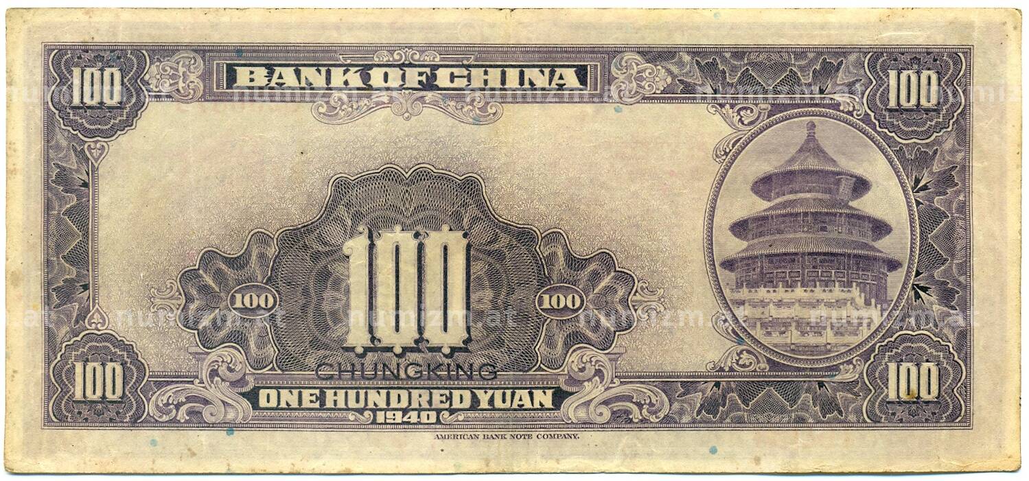 Банкнота 100 юаней 1940 года Китай (Артикул: K10-4601): подробные характеристики, качественные фотографии в высоком разрешении, низкая цена.