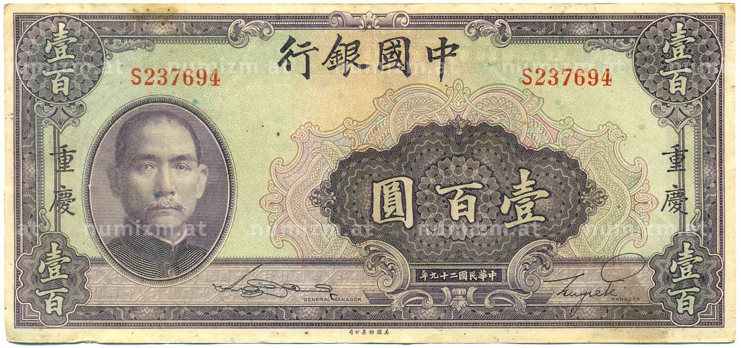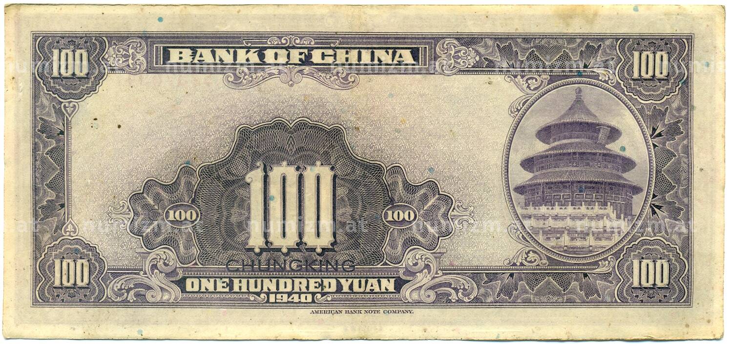Банкнота 100 юаней 1940 года Китай (Артикул: K10-4603): подробные характеристики, качественные фотографии в высоком разрешении, низкая цена.