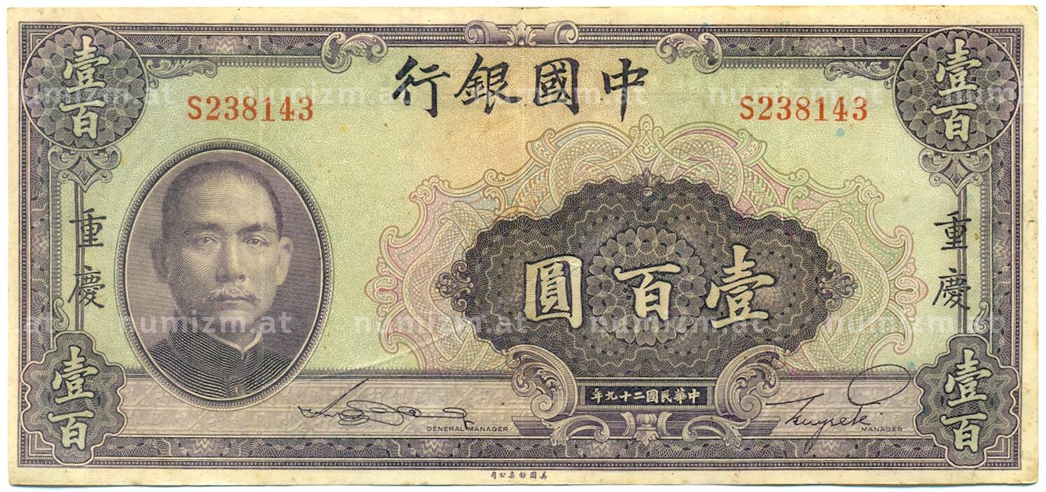 Банкнота 100 юаней 1940 года Китай (Артикул: K10-4607): подробные характеристики, качественные фотографии в высоком разрешении, низкая цена.