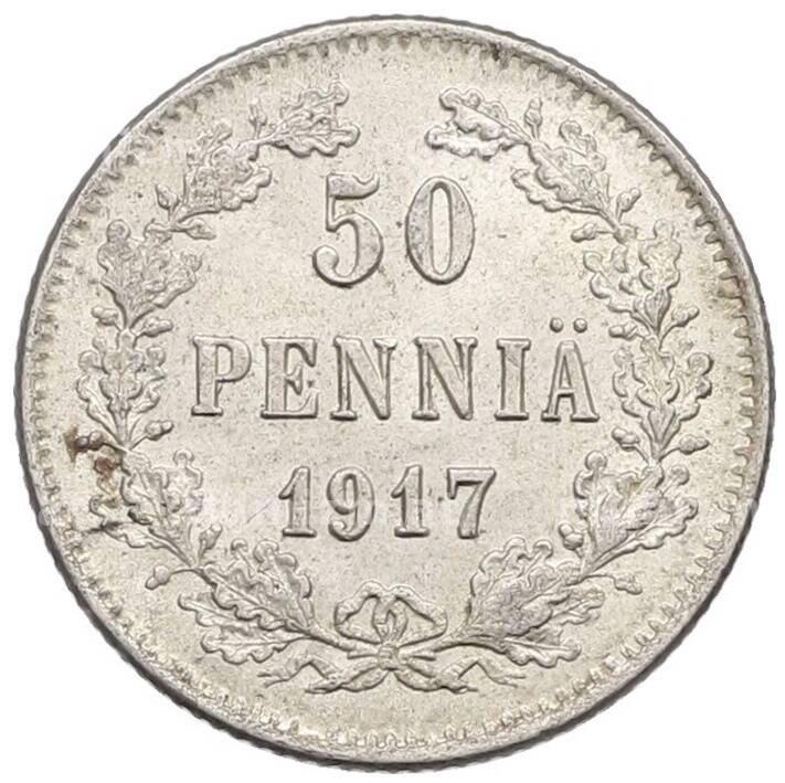 Монета 50 пенни 1917 года Русская Финляндия — Орел без корон (Временное правительство) (Артикул: K10-4800): подробные характеристики, качественные фотографии в высоком разрешении, низкая цена.