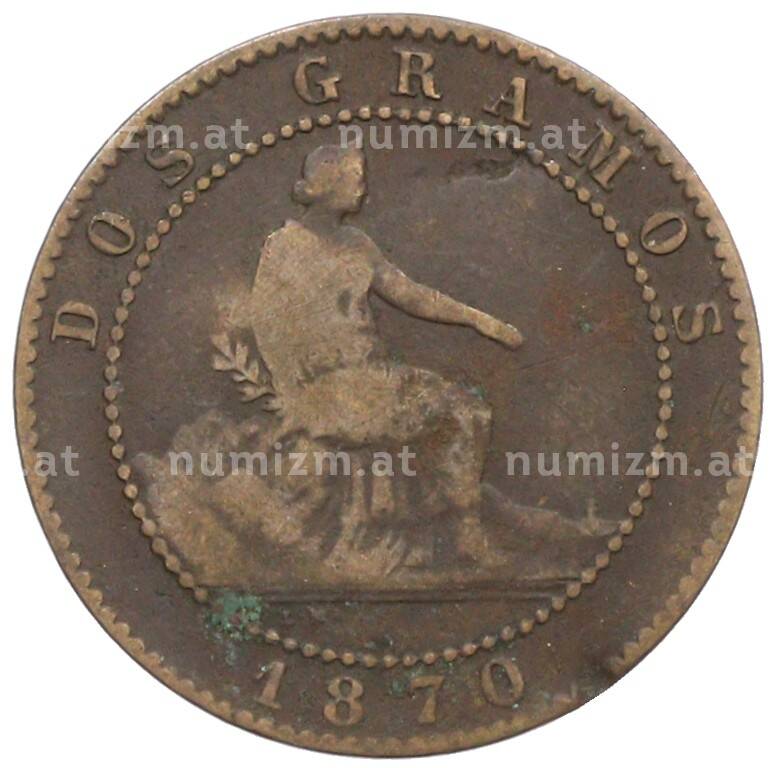 Монета 2 сентимо 1870 года Испания (Артикул: K10-5349): подробные характеристики, качественные фотографии в высоком разрешении, низкая цена.