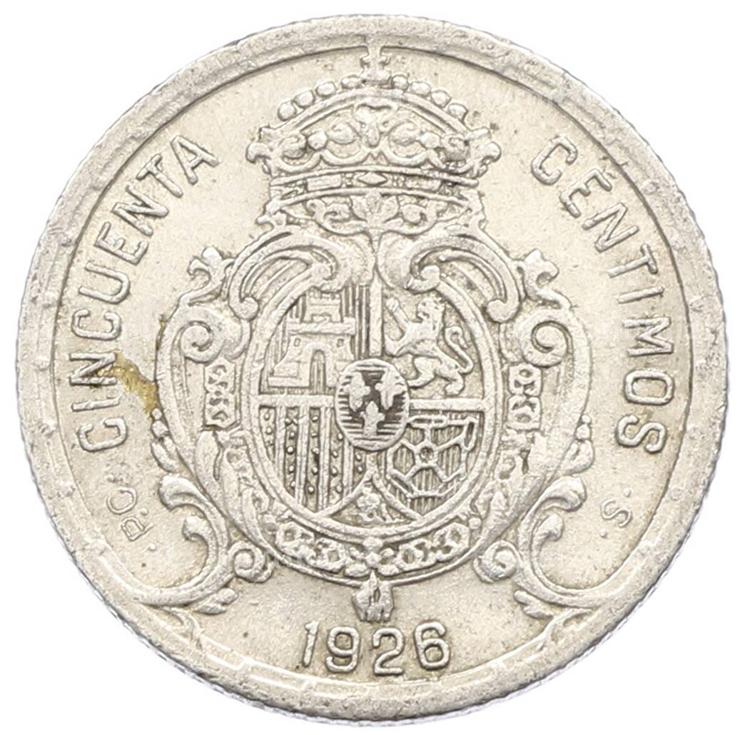 Купить 50 сентимо 1926 года Испания по привлекательной цене можно в нашем интернет-магазине — Вам достаточно оформить заказ на сайте. Все монеты, представленные в каталоге, находятся в наличии на нашем складе.