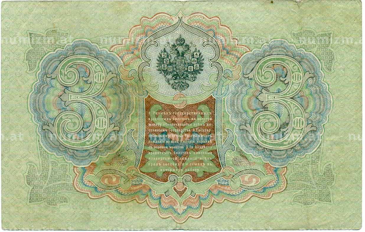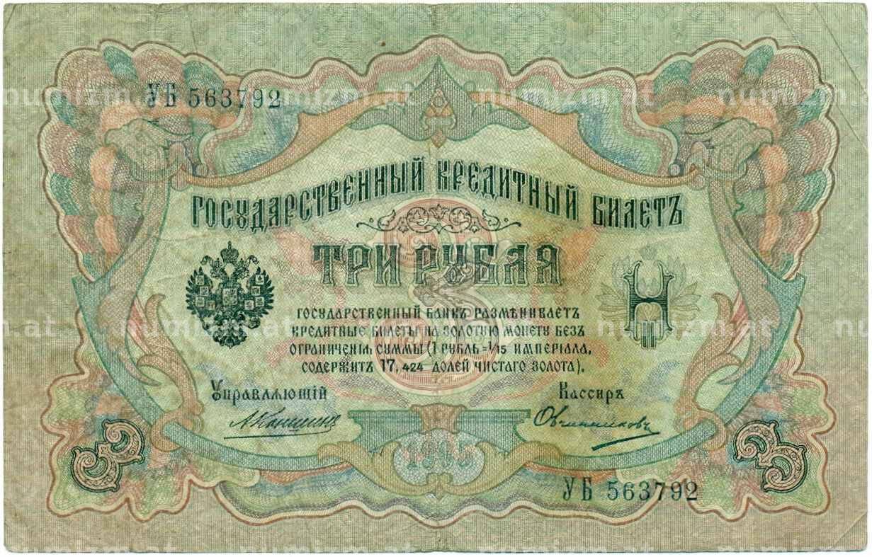 Банкнота 3 рубля 1905 года Коншин / Овчинников (Артикул: K10-6414): подробные характеристики, качественные фотографии в высоком разрешении, низкая цена.