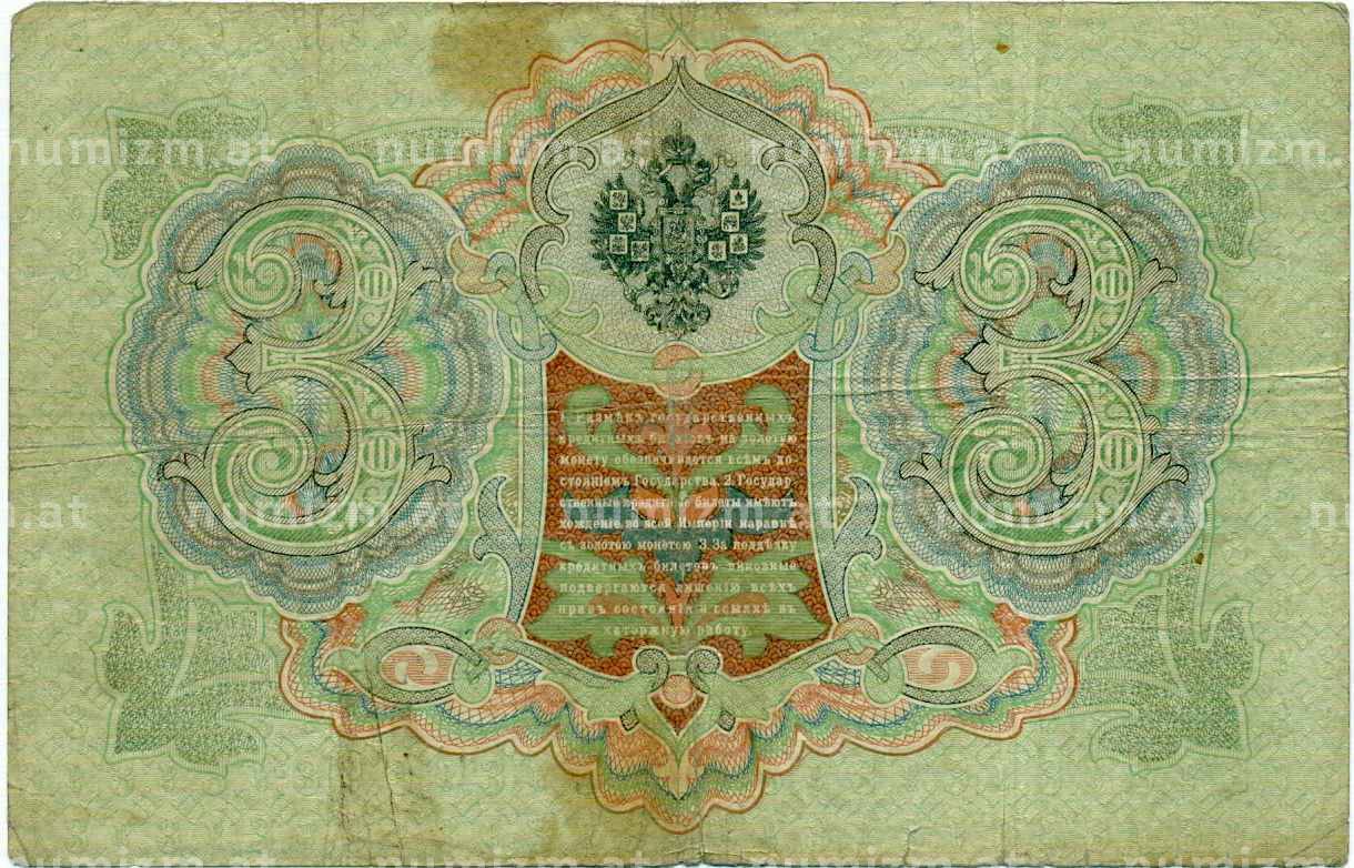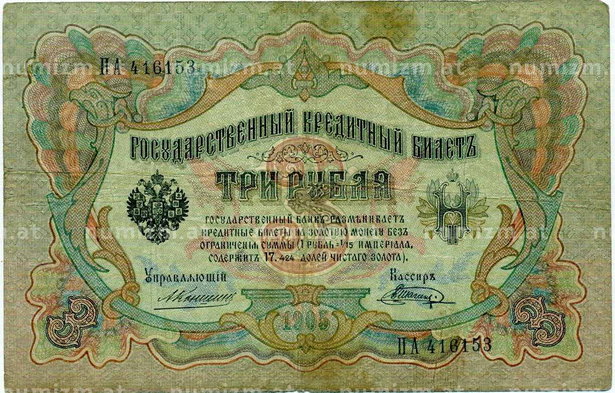 Банкнота 3 рубля 1905 года Коншин / Шагин (Артикул: K10-6462): подробные характеристики, качественные фотографии в высоком разрешении, низкая цена.