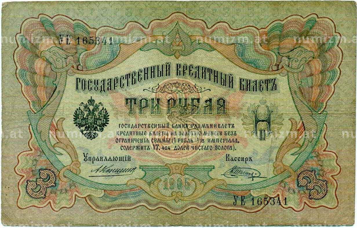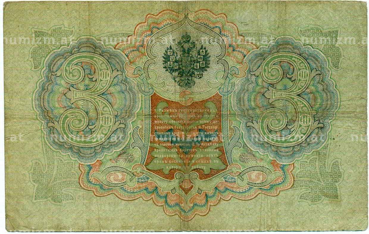 Банкнота 3 рубля 1905 года Коншин / Шагин (Артикул: K10-6463): подробные характеристики, качественные фотографии в высоком разрешении, низкая цена.