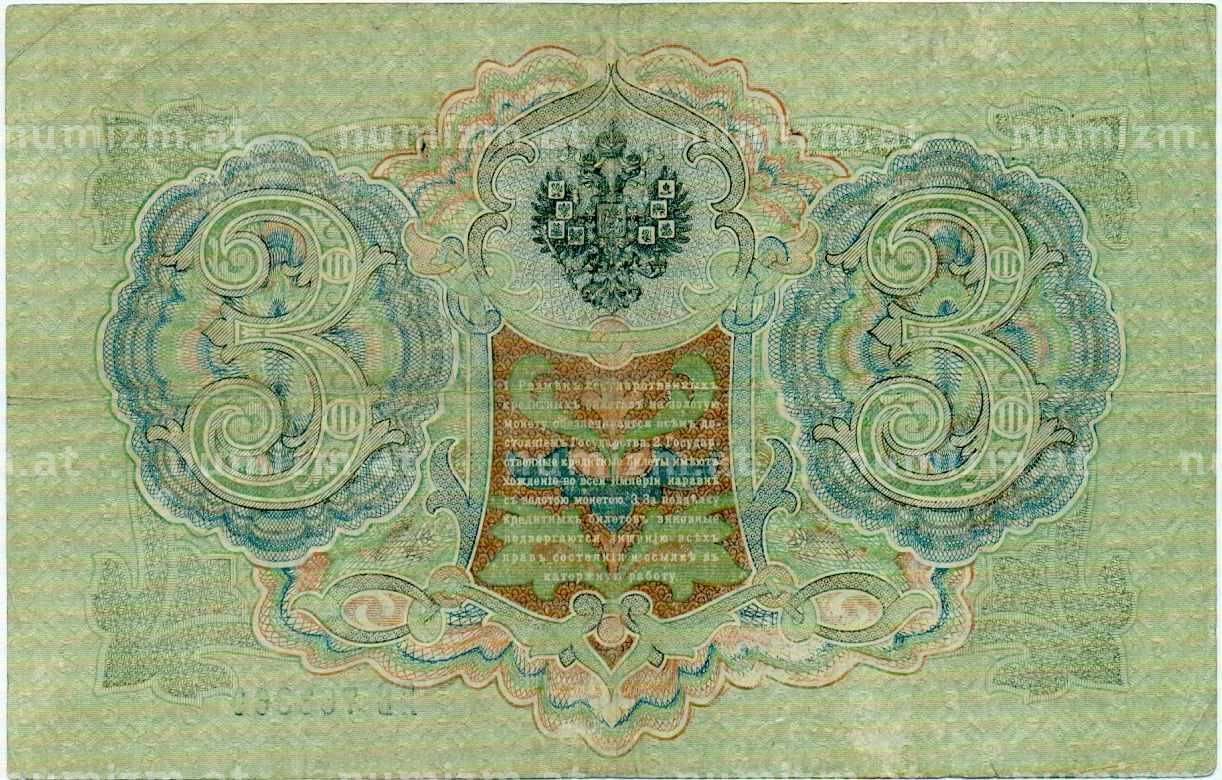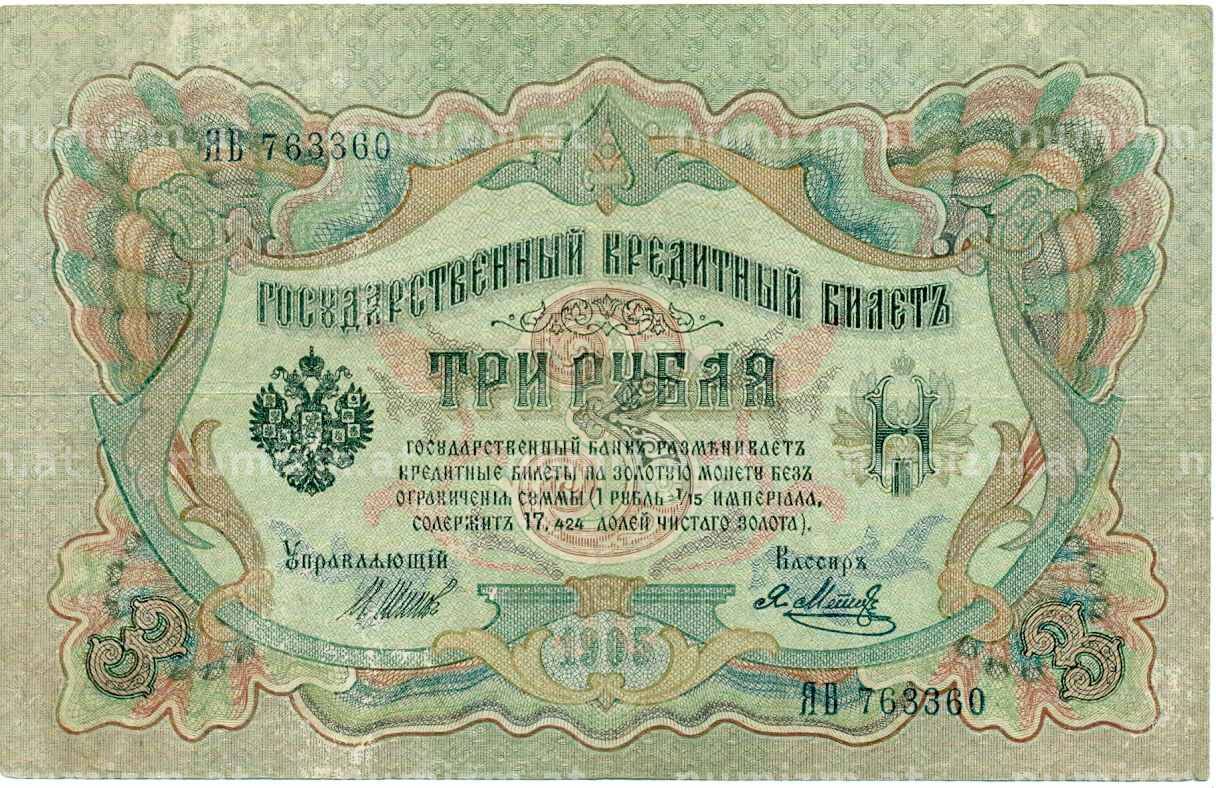 Банкнота 3 рубля 1905 года Шипов / Метц (Артикул: K10-6513): подробные характеристики, качественные фотографии в высоком разрешении, низкая цена.