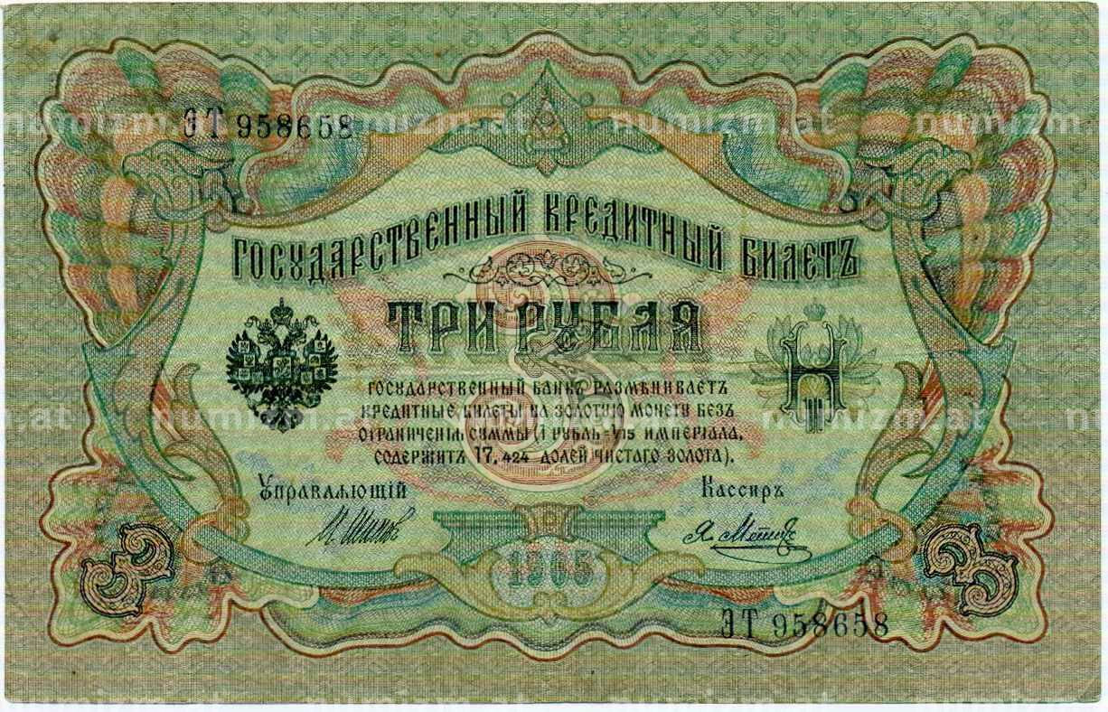 Банкнота 3 рубля 1905 года Шипов / Метц (Артикул: K10-6515): подробные характеристики, качественные фотографии в высоком разрешении, низкая цена.