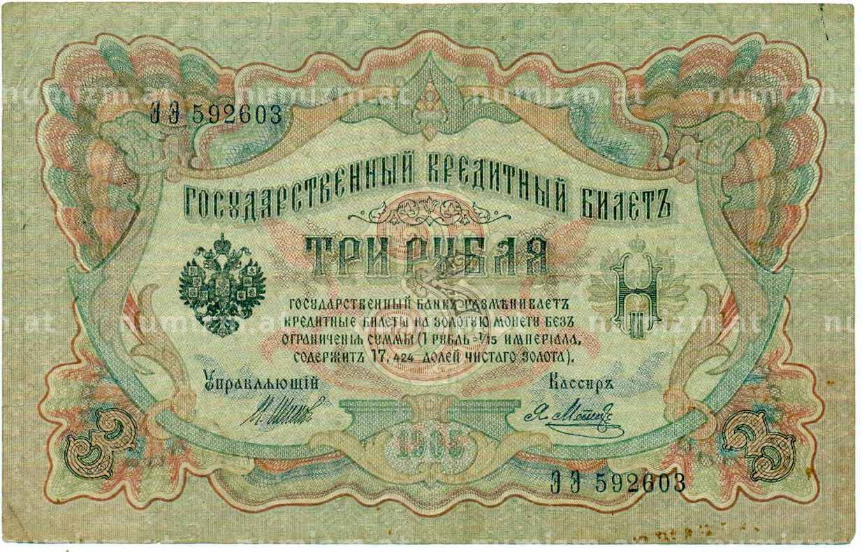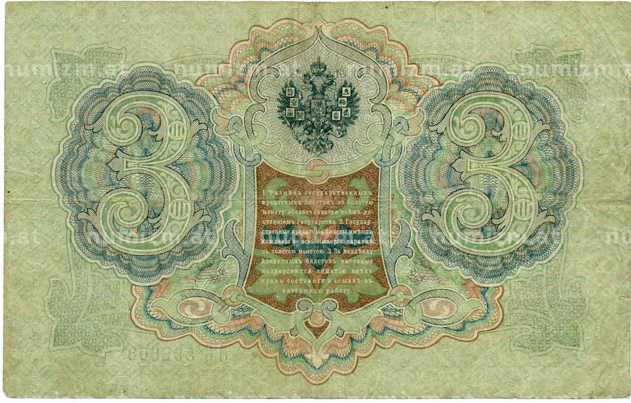 Банкнота 3 рубля 1905 года Шипов / Метц (Артикул: K10-6520): подробные характеристики, качественные фотографии в высоком разрешении, низкая цена.
