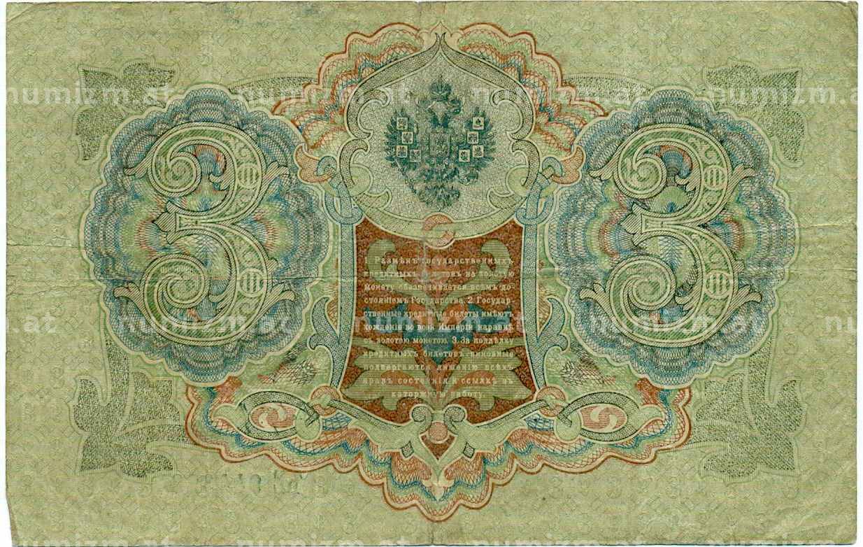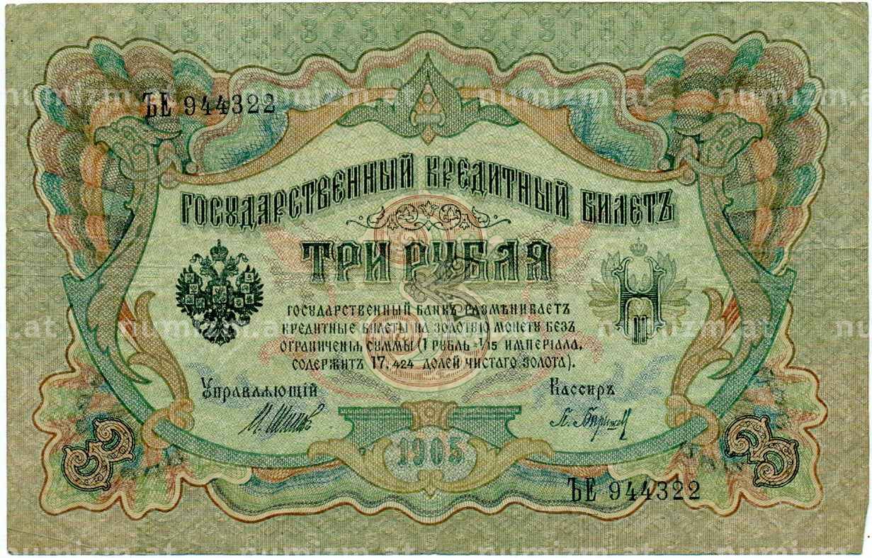 Банкнота 3 рубля 1905 года Шипов / Барышев (Артикул: K10-6535): подробные характеристики, качественные фотографии в высоком разрешении, низкая цена.