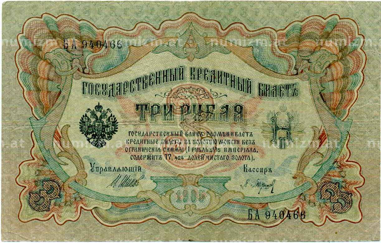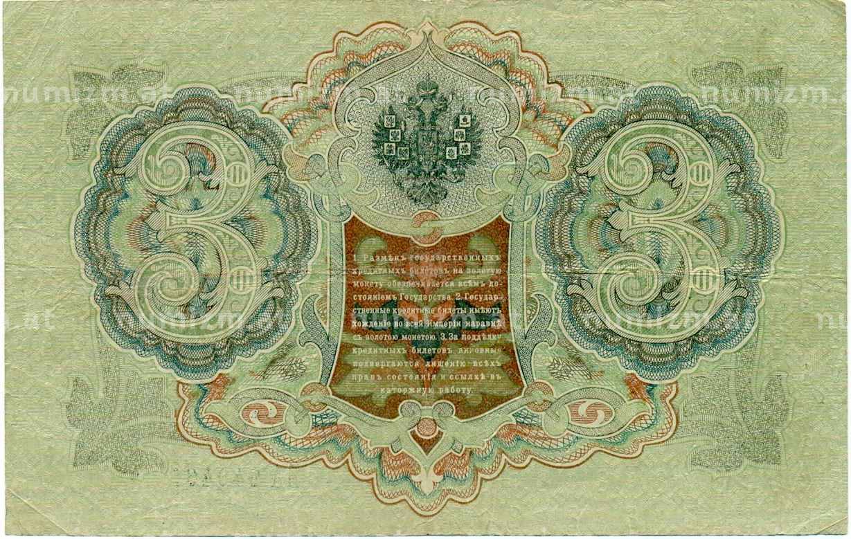 Банкнота 3 рубля 1905 года Шипов / Барышев (Артикул: K10-6538): подробные характеристики, качественные фотографии в высоком разрешении, низкая цена.