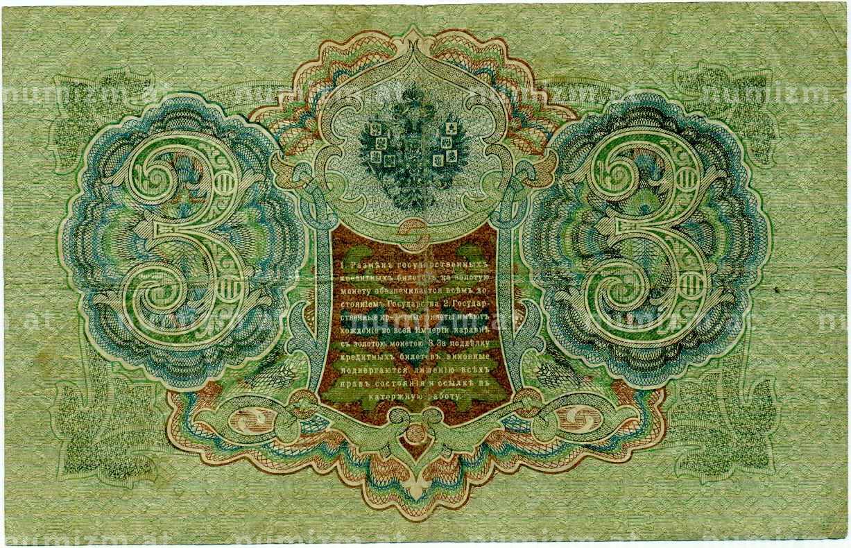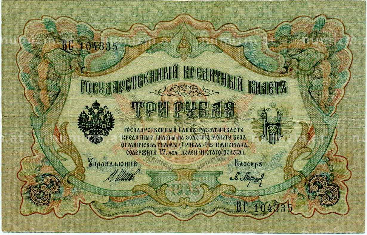 Банкнота 3 рубля 1905 года Шипов / Барышев (Артикул: K10-6569): подробные характеристики, качественные фотографии в высоком разрешении, низкая цена.