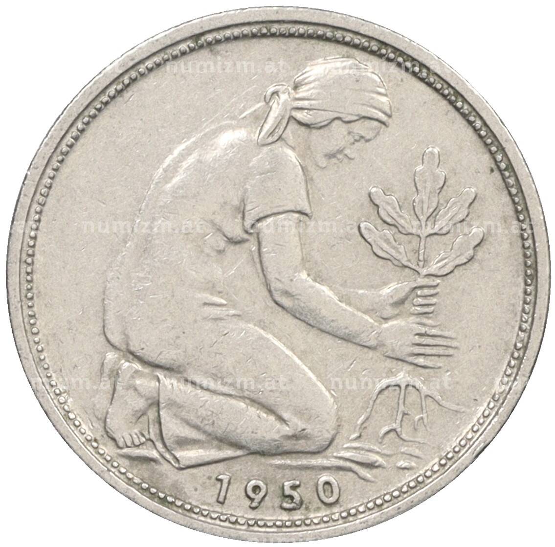 Купить 50 пфеннигов 1950 года D Западная Германия (ФРГ) по привлекательной цене можно в нашем интернет-магазине — Вам достаточно оформить заказ на сайте. Все монеты, представленные в каталоге, находятся в наличии на нашем складе.