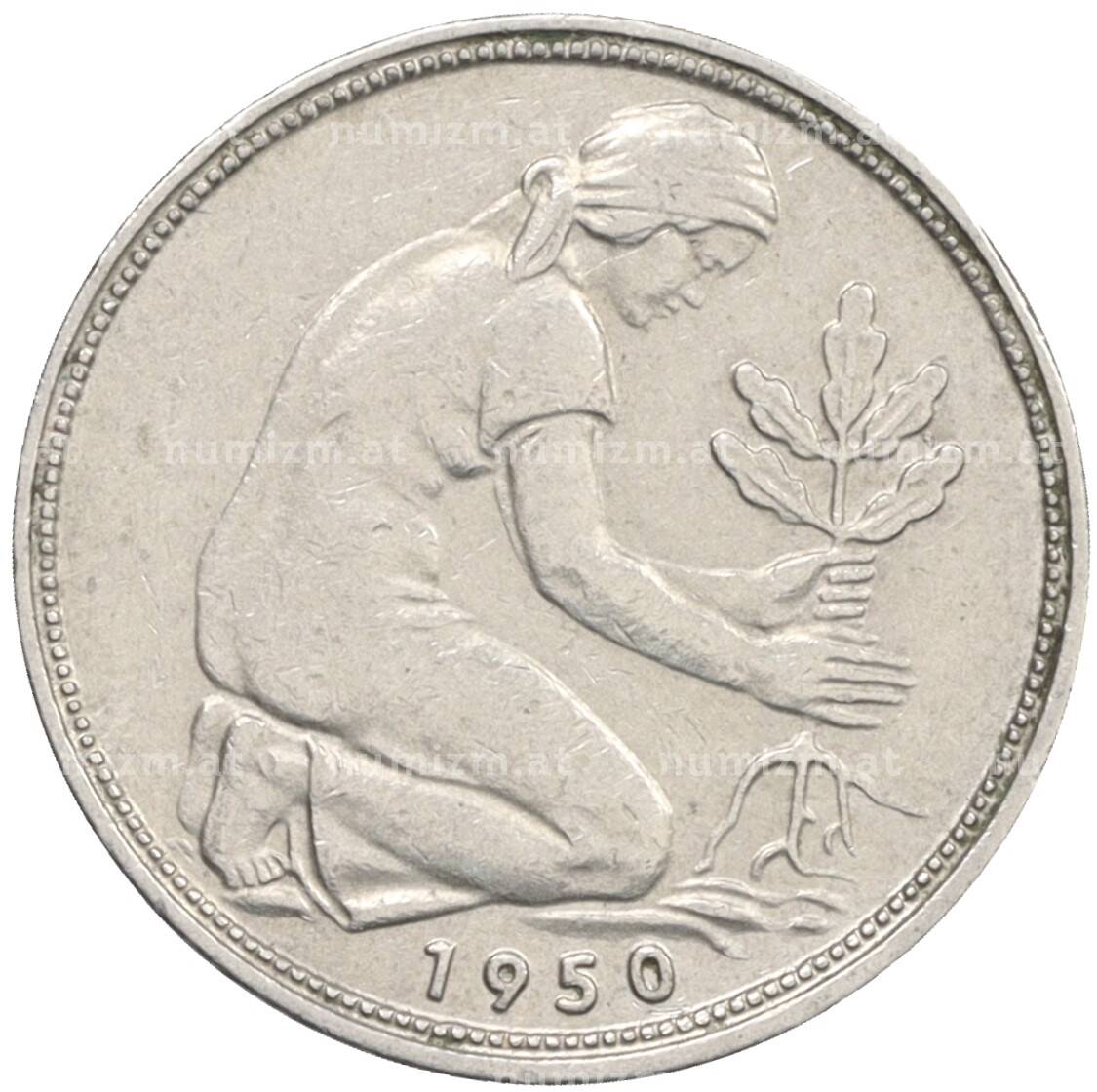 Монета 50 пфеннигов 1950 года J Западная Германия (ФРГ) (Артикул: K10-6758): подробные характеристики, качественные фотографии в высоком разрешении, низкая цена.