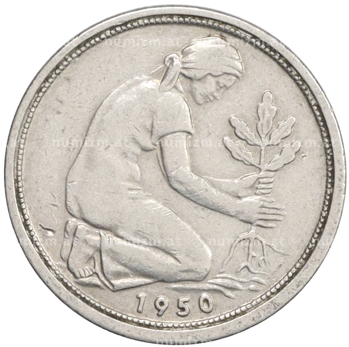 Монета 50 пфеннигов 1950 года J Западная Германия (ФРГ) (Артикул: K10-6760): подробные характеристики, качественные фотографии в высоком разрешении, низкая цена.