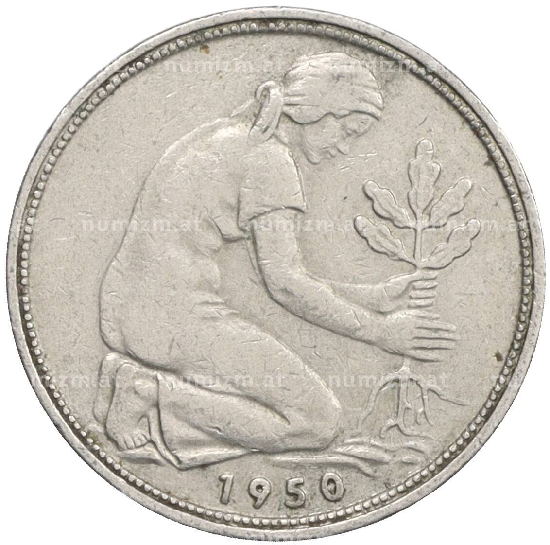 Монета 50 пфеннигов 1950 года J Западная Германия (ФРГ) (Артикул: K10-6762): подробные характеристики, качественные фотографии в высоком разрешении, низкая цена.