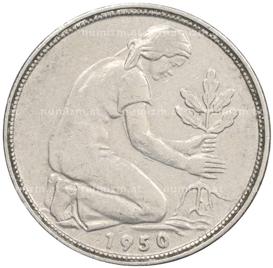 Монета 50 пфеннигов 1950 года J Западная Германия (ФРГ) (Артикул: K10-6763): подробные характеристики, качественные фотографии в высоком разрешении, низкая цена.