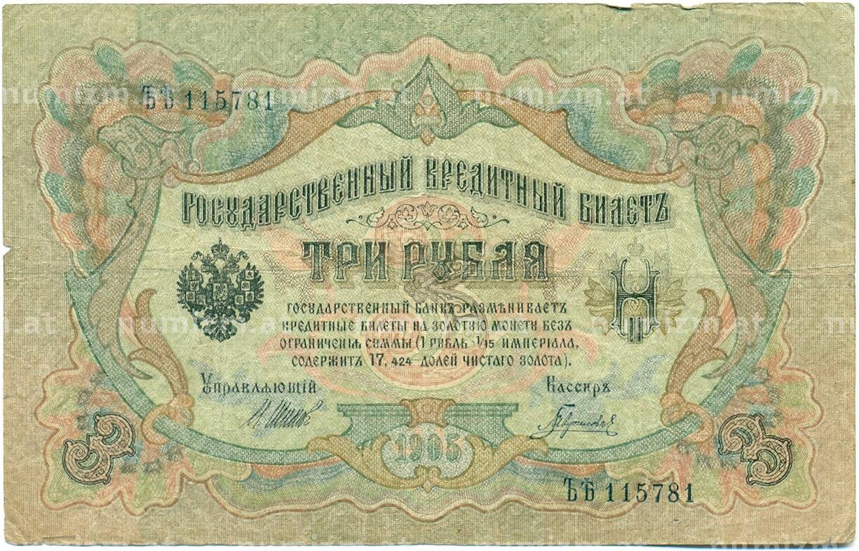 Банкнота 3 рубля 1905 года Шипов / Гаврилов (Артикул: K10-7108): подробные характеристики, качественные фотографии в высоком разрешении, низкая цена.