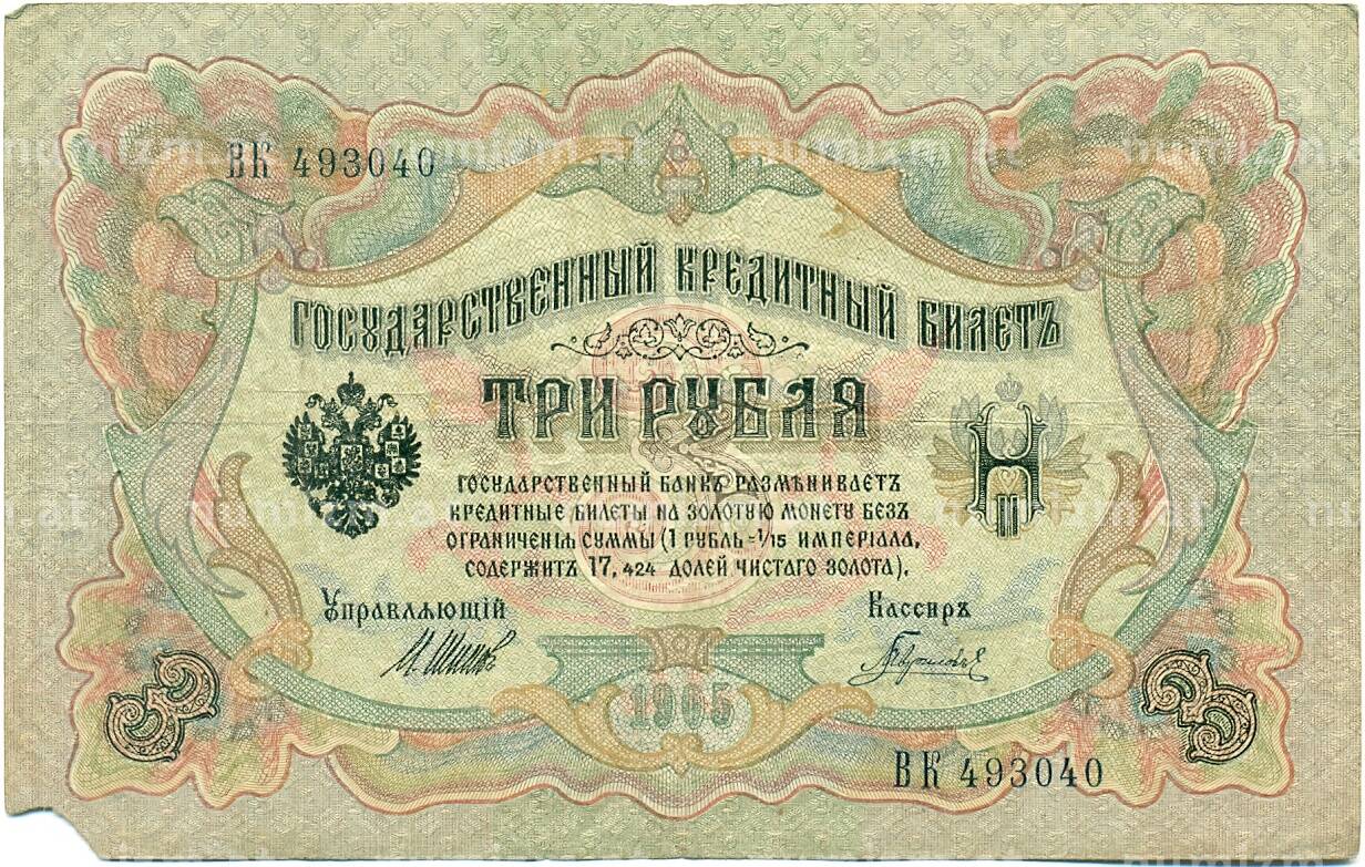 Банкнота 3 рубля 1905 года Шипов / Гаврилов (Артикул: K10-7126): подробные характеристики, качественные фотографии в высоком разрешении, низкая цена.