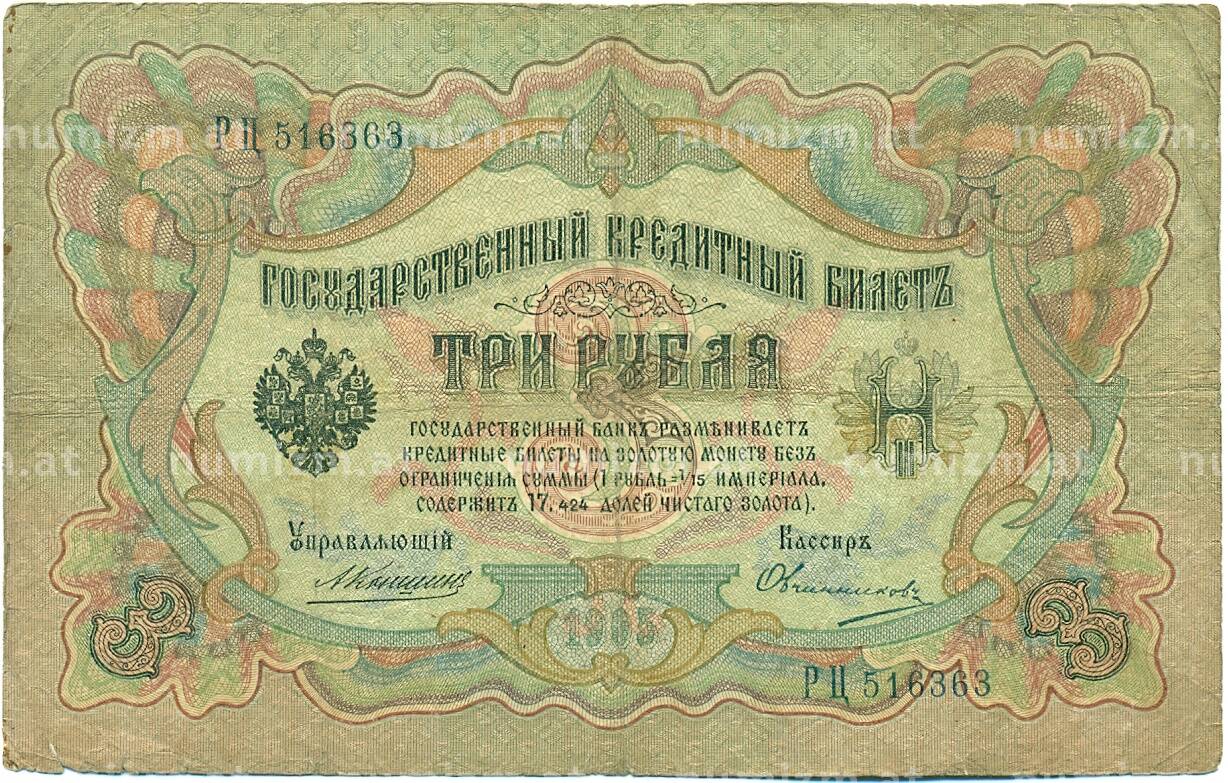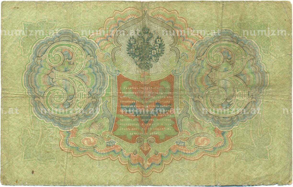 Банкнота 3 рубля 1905 года Коншин / Овчинников (Артикул: K10-7127): подробные характеристики, качественные фотографии в высоком разрешении, низкая цена.