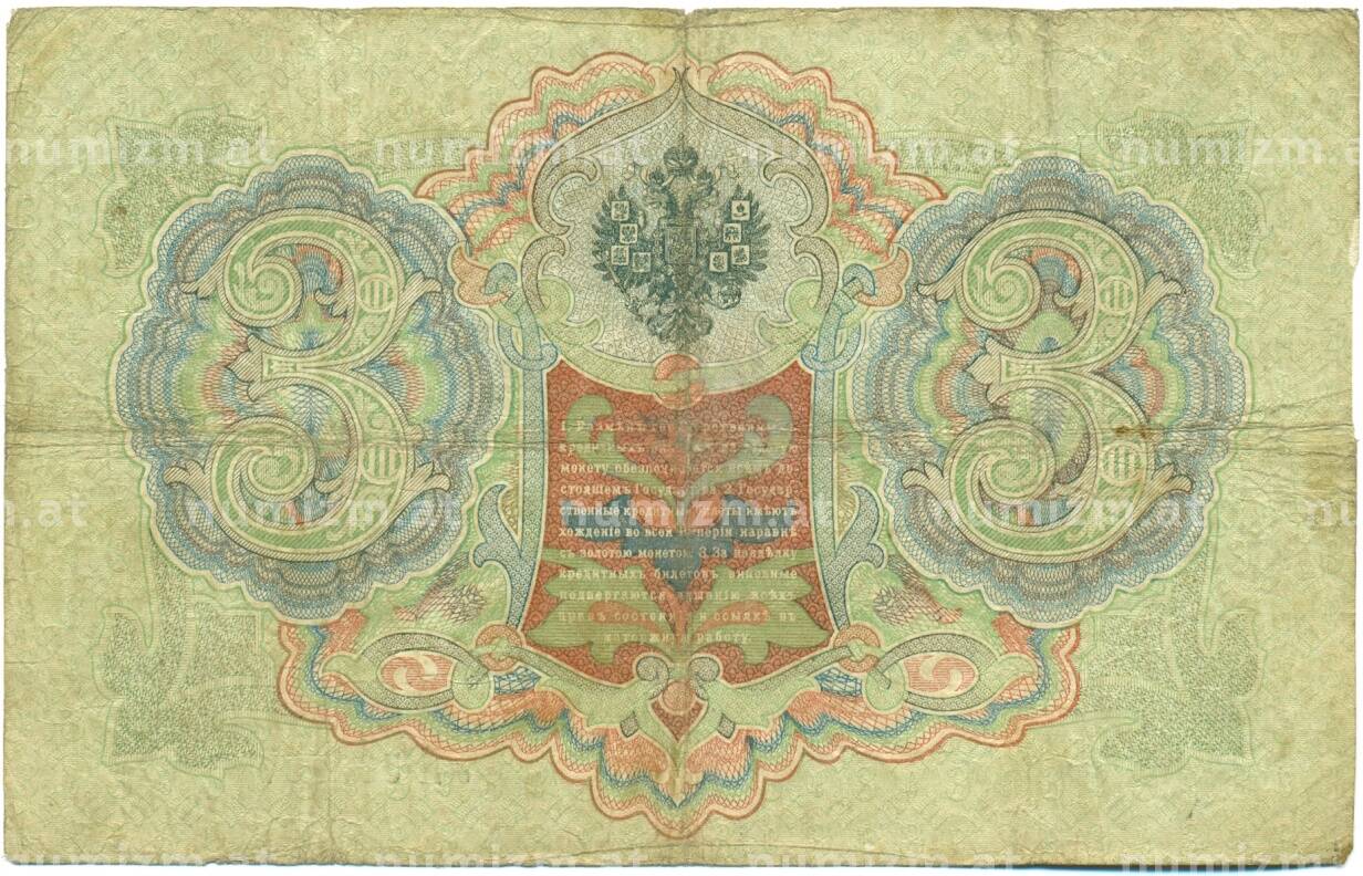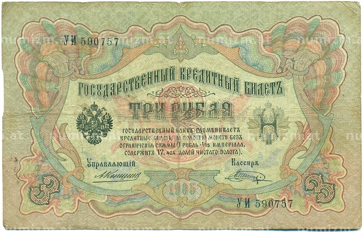 Банкнота 3 рубля 1905 года Коншин / Шагин (Артикул: K10-7136): подробные характеристики, качественные фотографии в высоком разрешении, низкая цена.