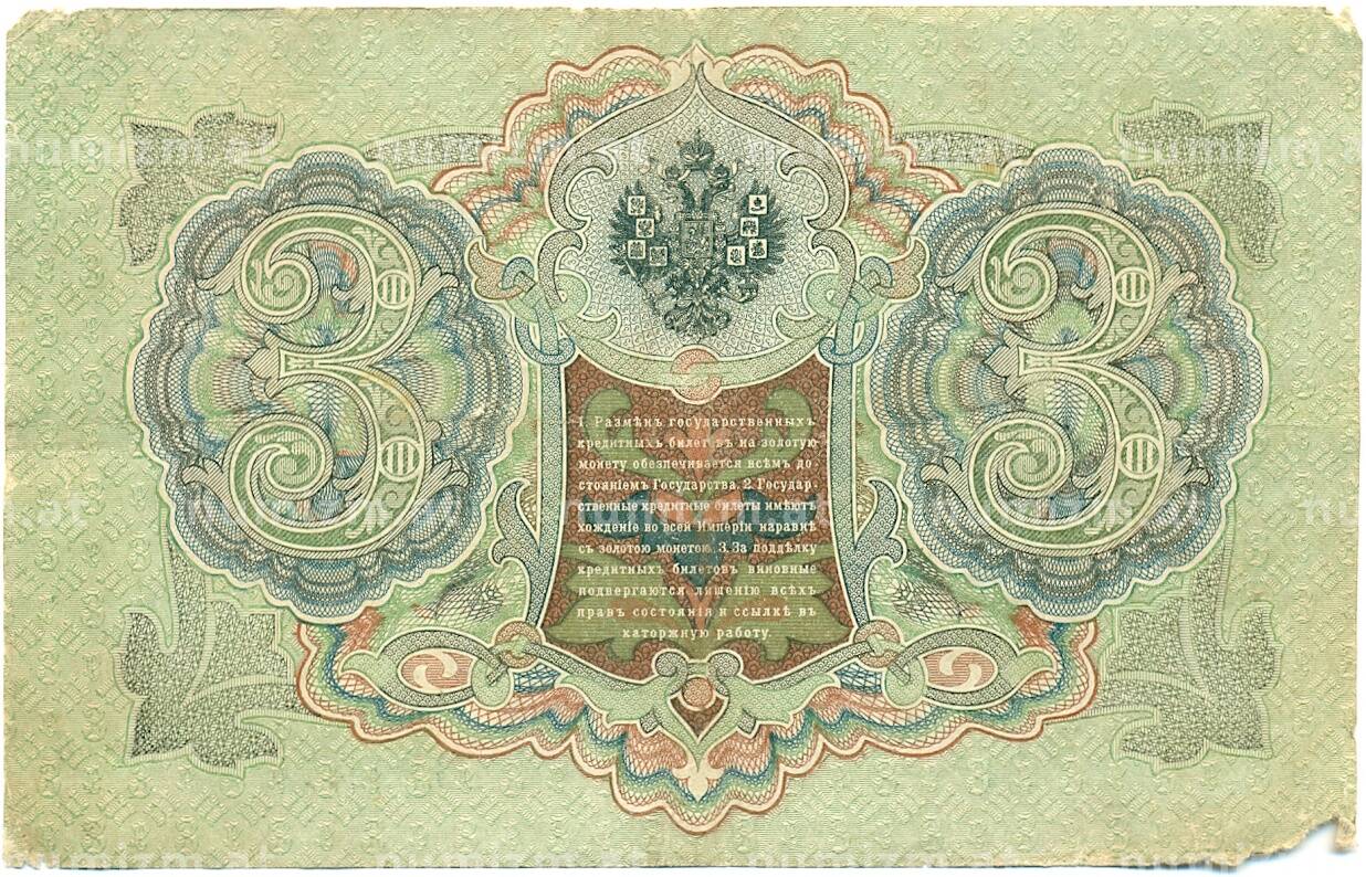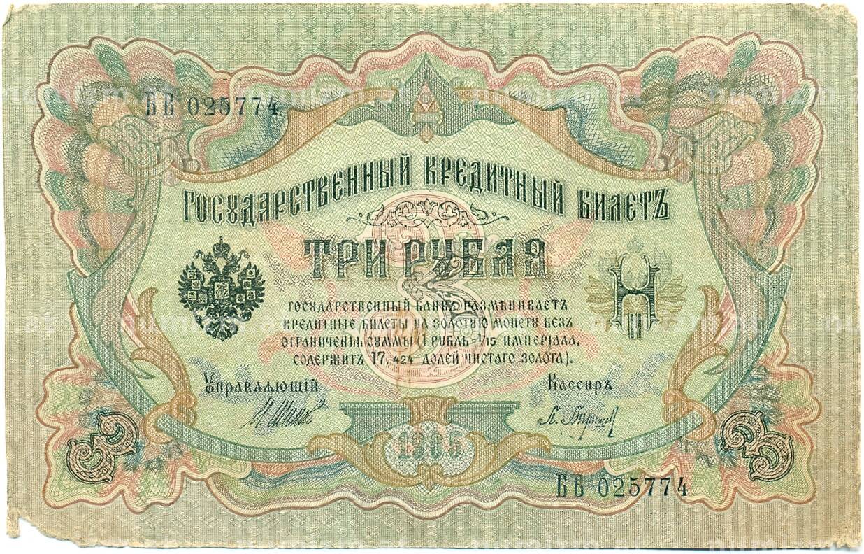 Банкнота 3 рубля 1905 года Шипов / Барышев (Артикул: K10-7152): подробные характеристики, качественные фотографии в высоком разрешении, низкая цена.