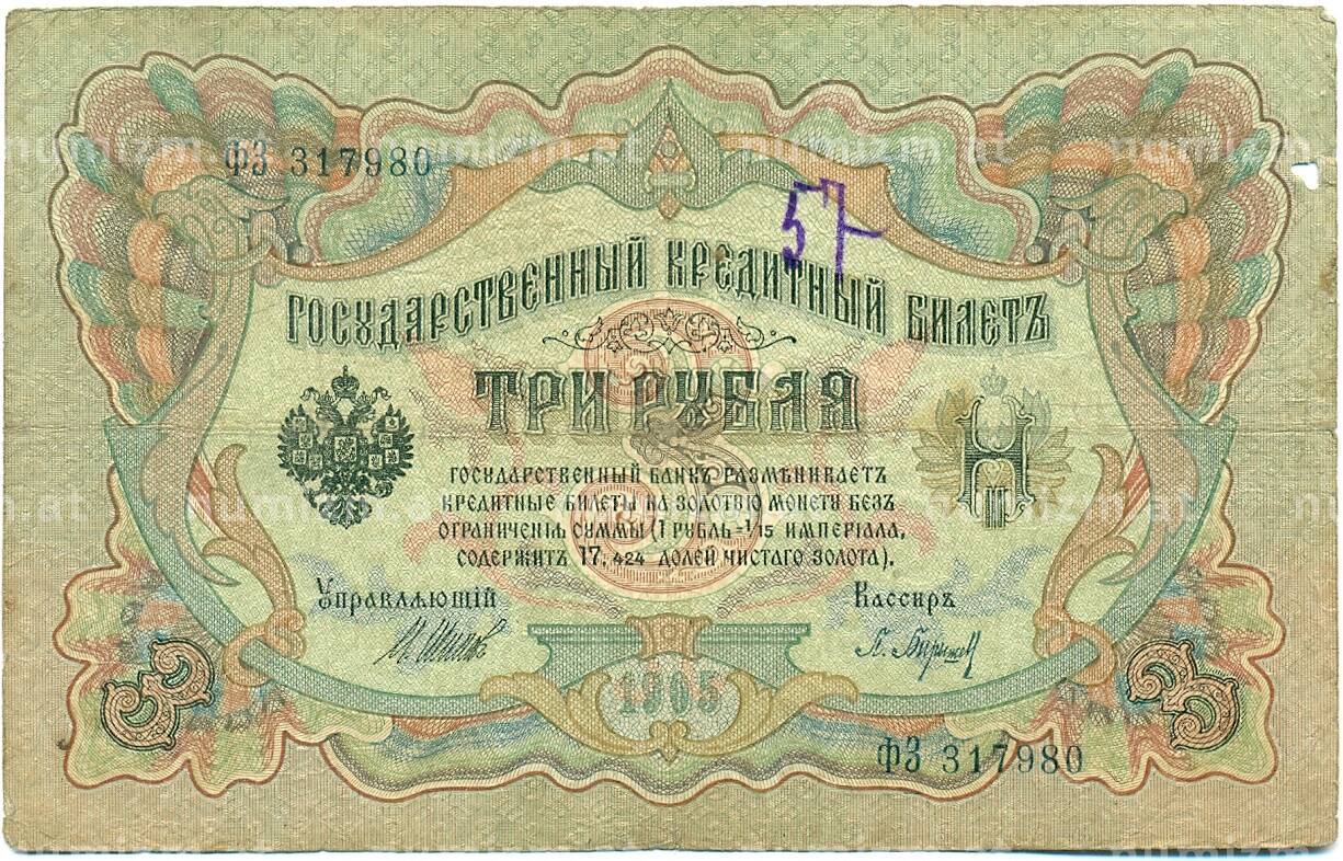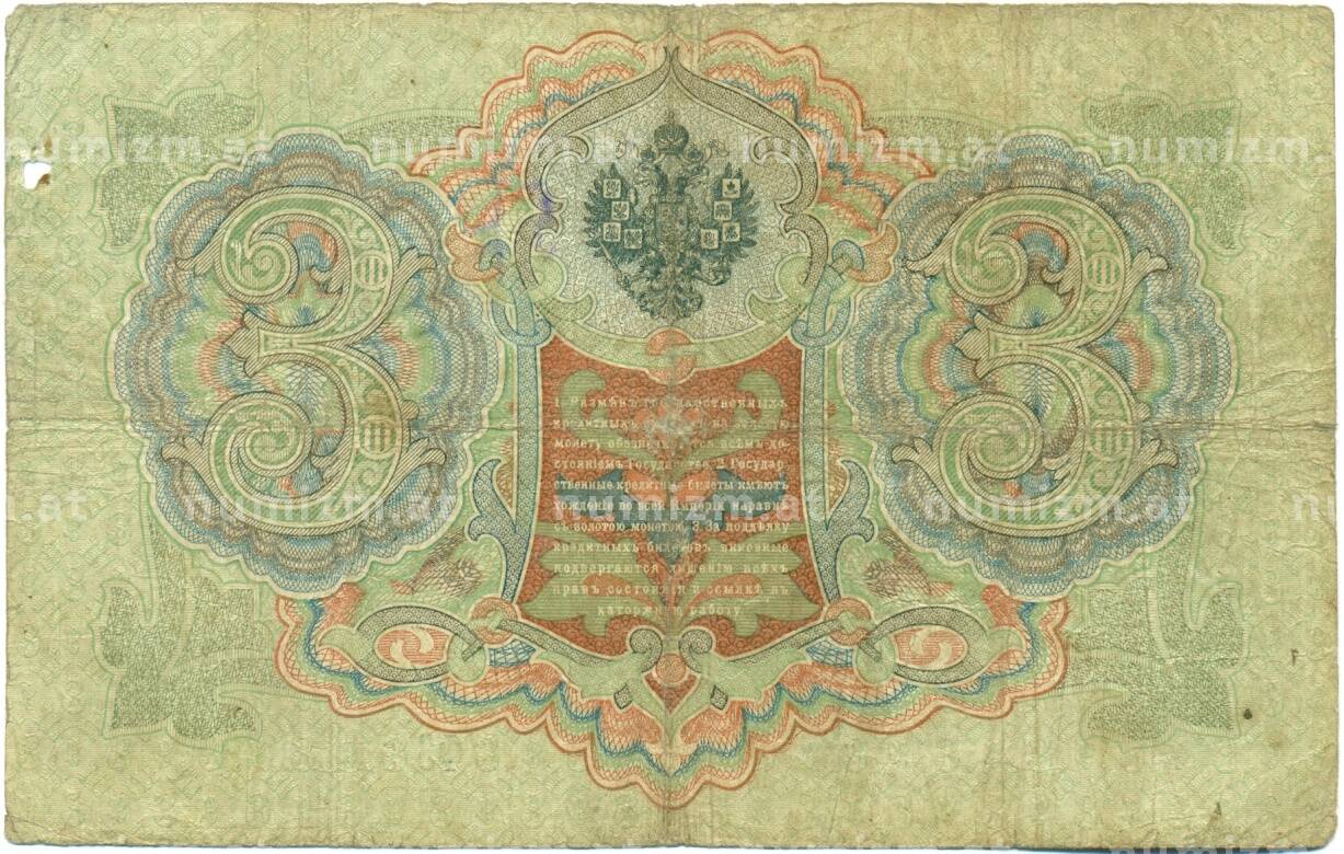 Банкнота 3 рубля 1905 года Шипов / Барышев (Артикул: K10-7158): подробные характеристики, качественные фотографии в высоком разрешении, низкая цена.