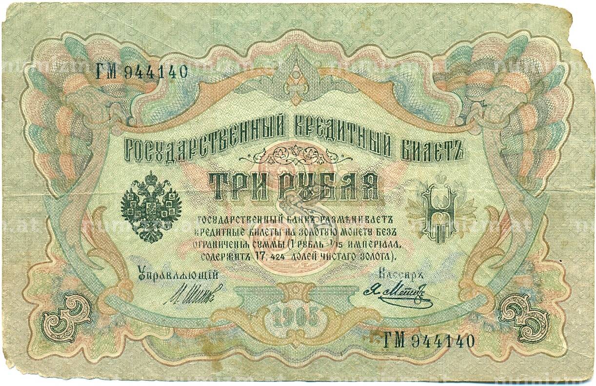 20.01.2025Интернет магазин «Нумизмат» предлагает приобрести 3 рубля 1905 года Шипов / Метц.