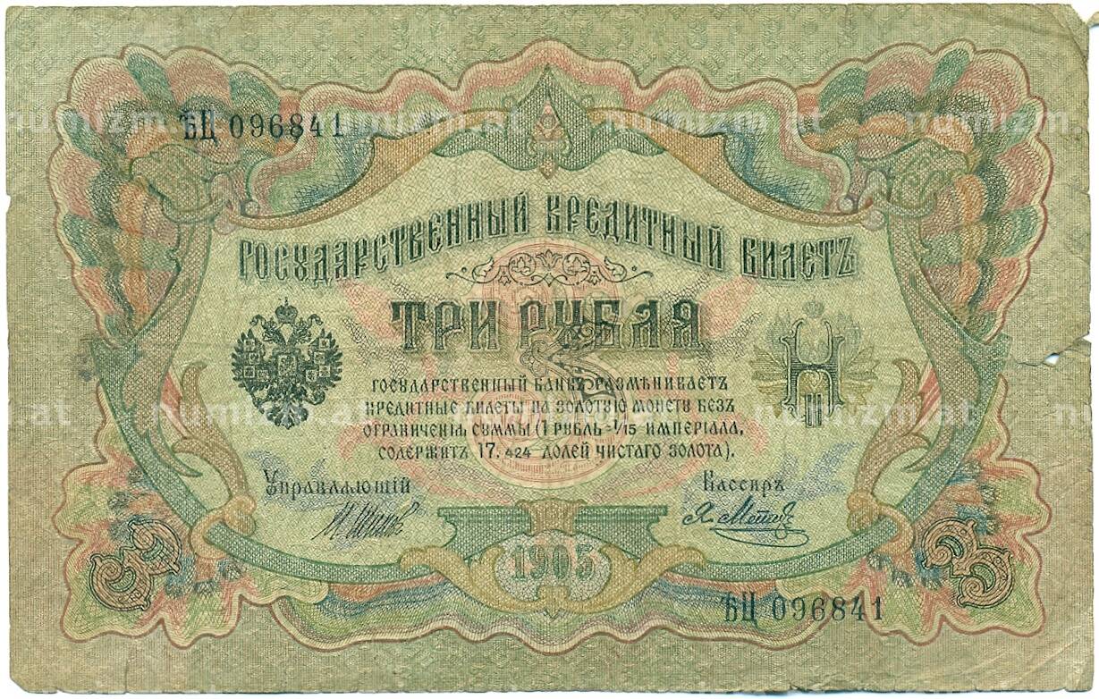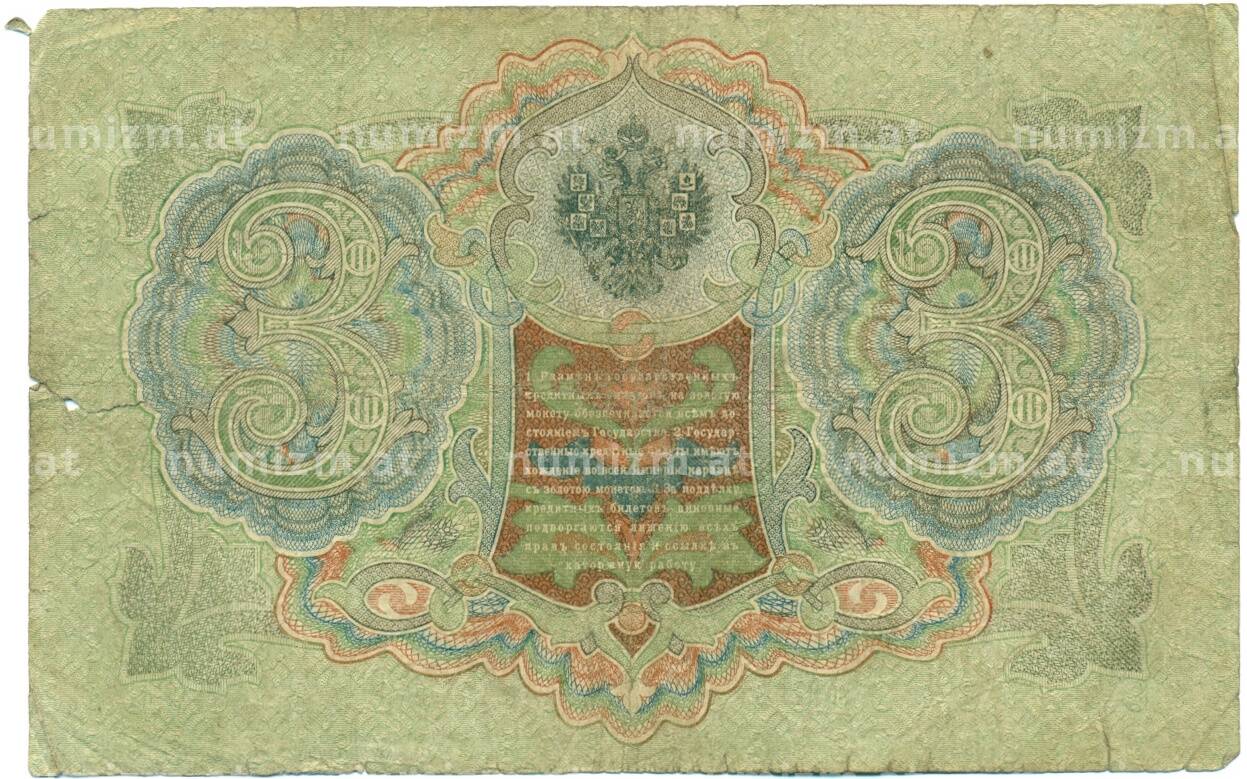 Банкнота 3 рубля 1905 года Шипов / Метц (Артикул: K10-7167): подробные характеристики, качественные фотографии в высоком разрешении, низкая цена.