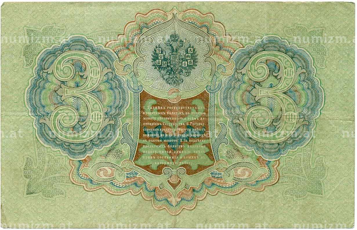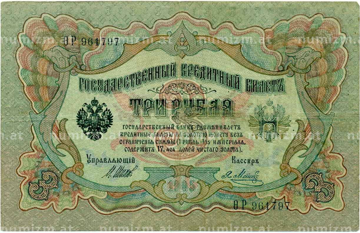 Банкнота 3 рубля 1905 года Шипов / Метц (Артикул: K10-7239): подробные характеристики, качественные фотографии в высоком разрешении, низкая цена.