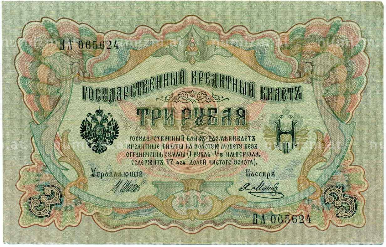 Банкнота 3 рубля 1905 года Шипов / Метц (Артикул: K10-7244): подробные характеристики, качественные фотографии в высоком разрешении, низкая цена.