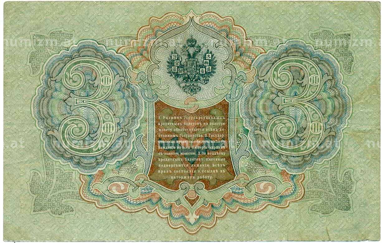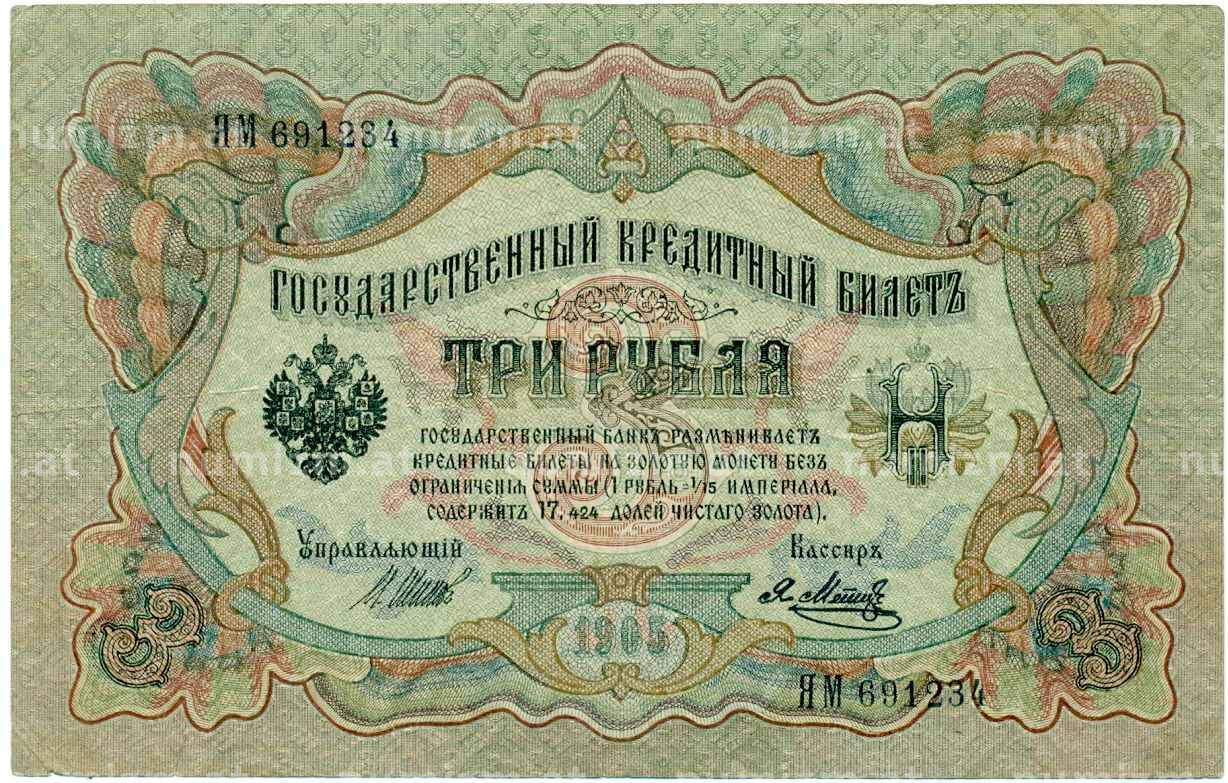 Банкнота 3 рубля 1905 года Шипов / Метц (Артикул: K10-7246): подробные характеристики, качественные фотографии в высоком разрешении, низкая цена.