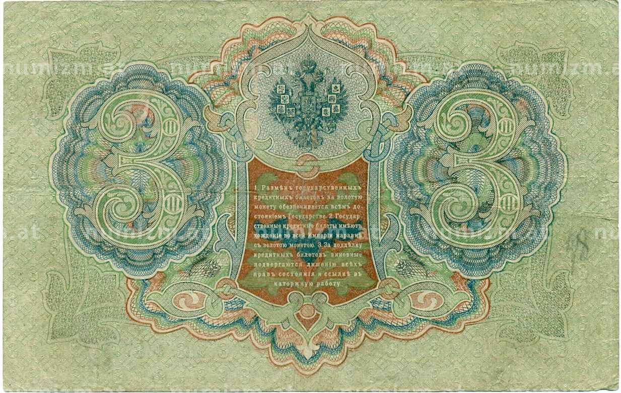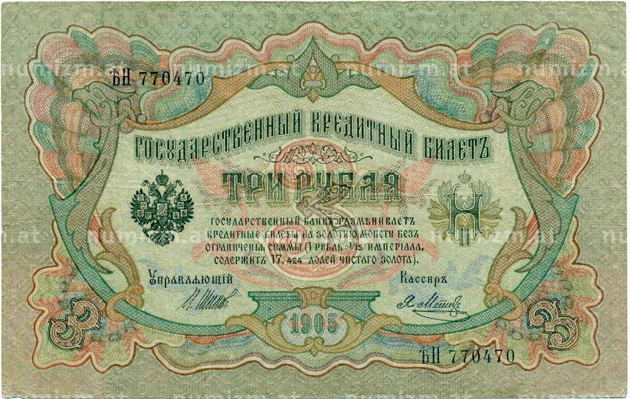 Банкнота 3 рубля 1905 года Шипов / Метц (Артикул: K10-7254): подробные характеристики, качественные фотографии в высоком разрешении, низкая цена.