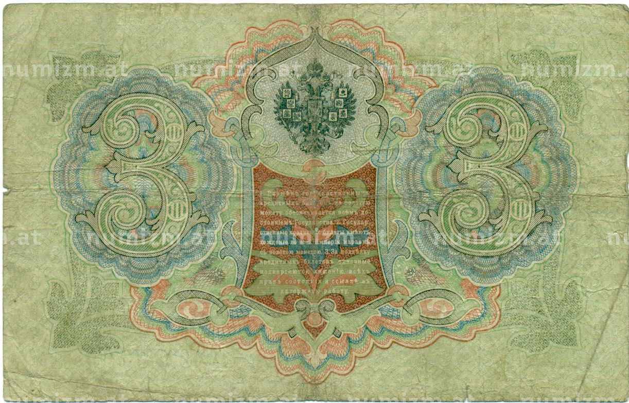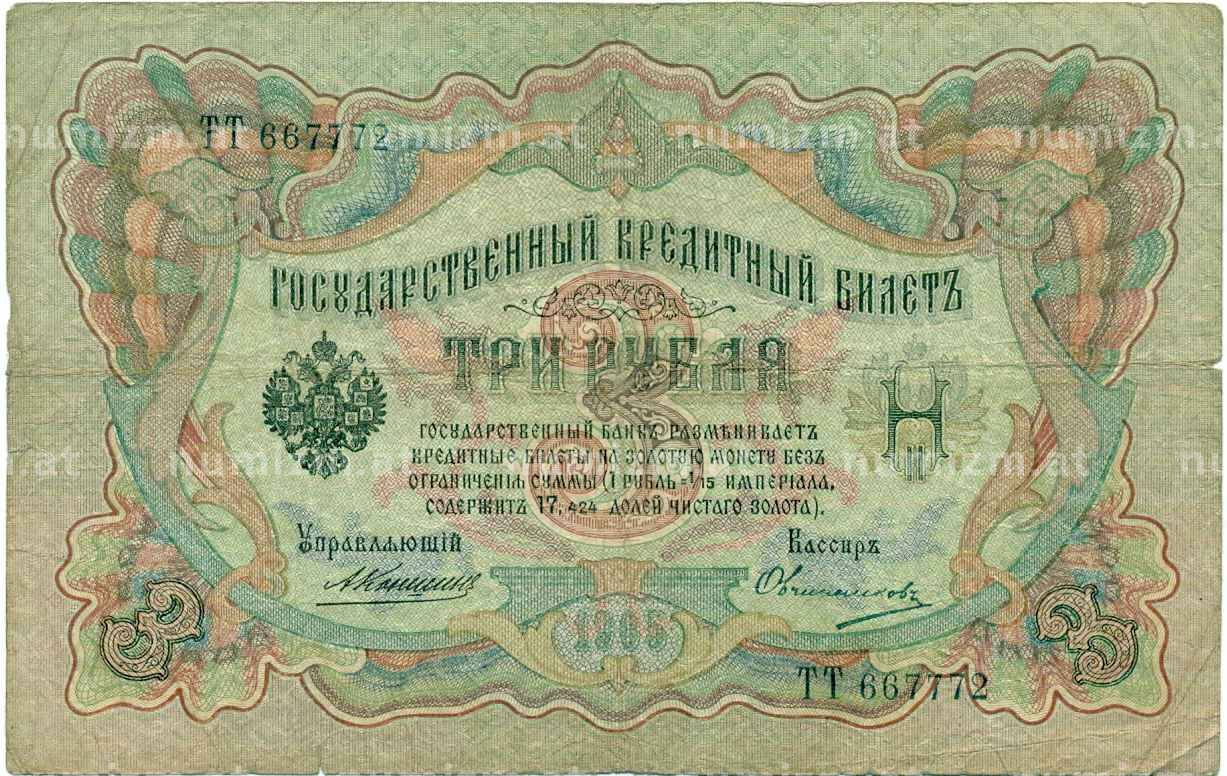 Банкнота 3 рубля 1905 года Коншин / Овчинников (Артикул: K10-7308): подробные характеристики, качественные фотографии в высоком разрешении, низкая цена.
