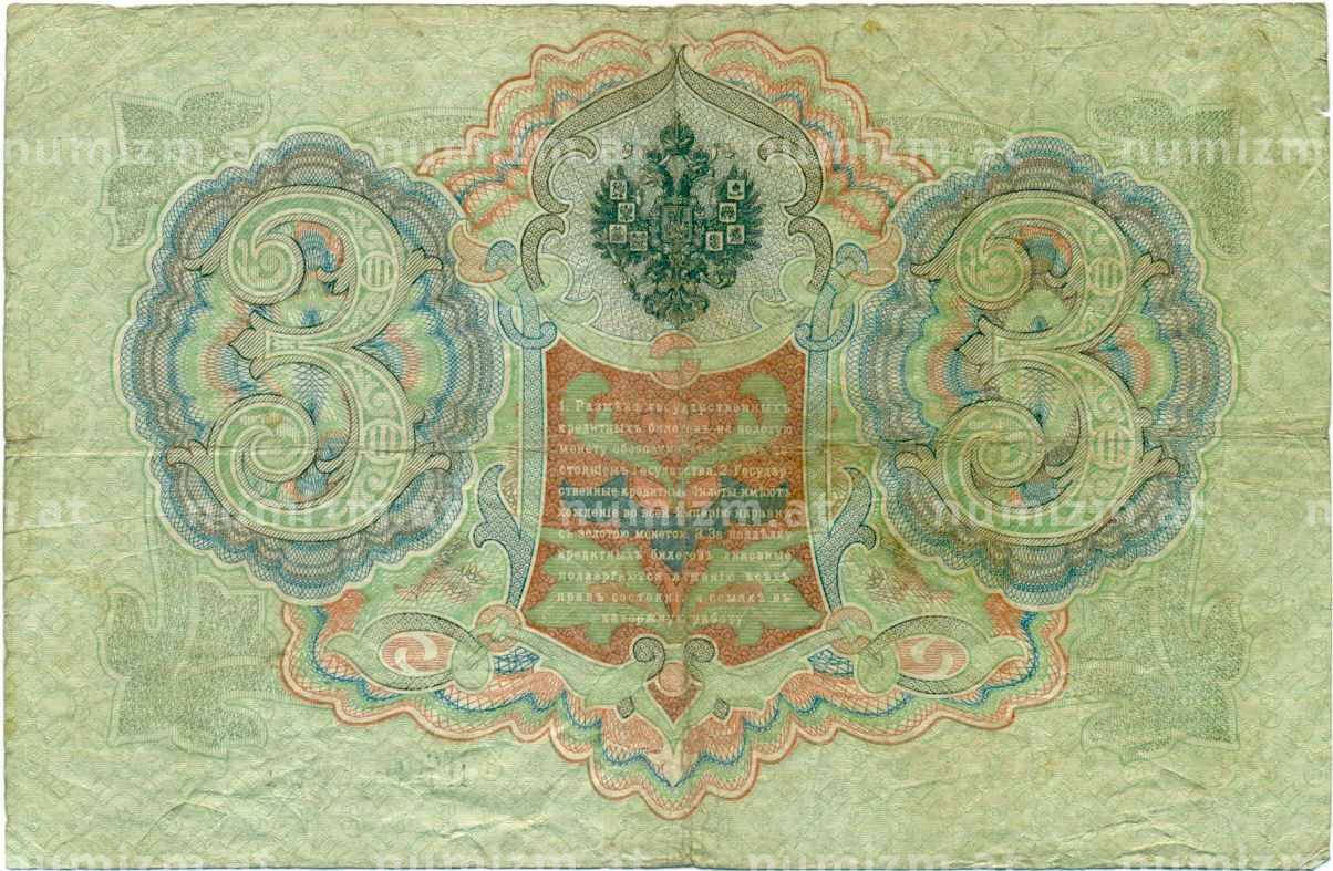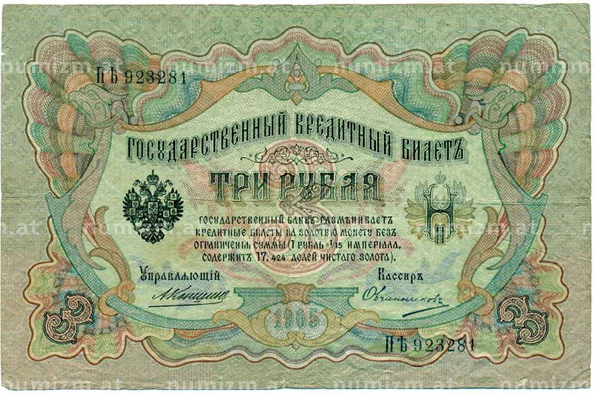 Банкнота 3 рубля 1905 года Коншин / Овчинников (Артикул: K10-7312): подробные характеристики, качественные фотографии в высоком разрешении, низкая цена.