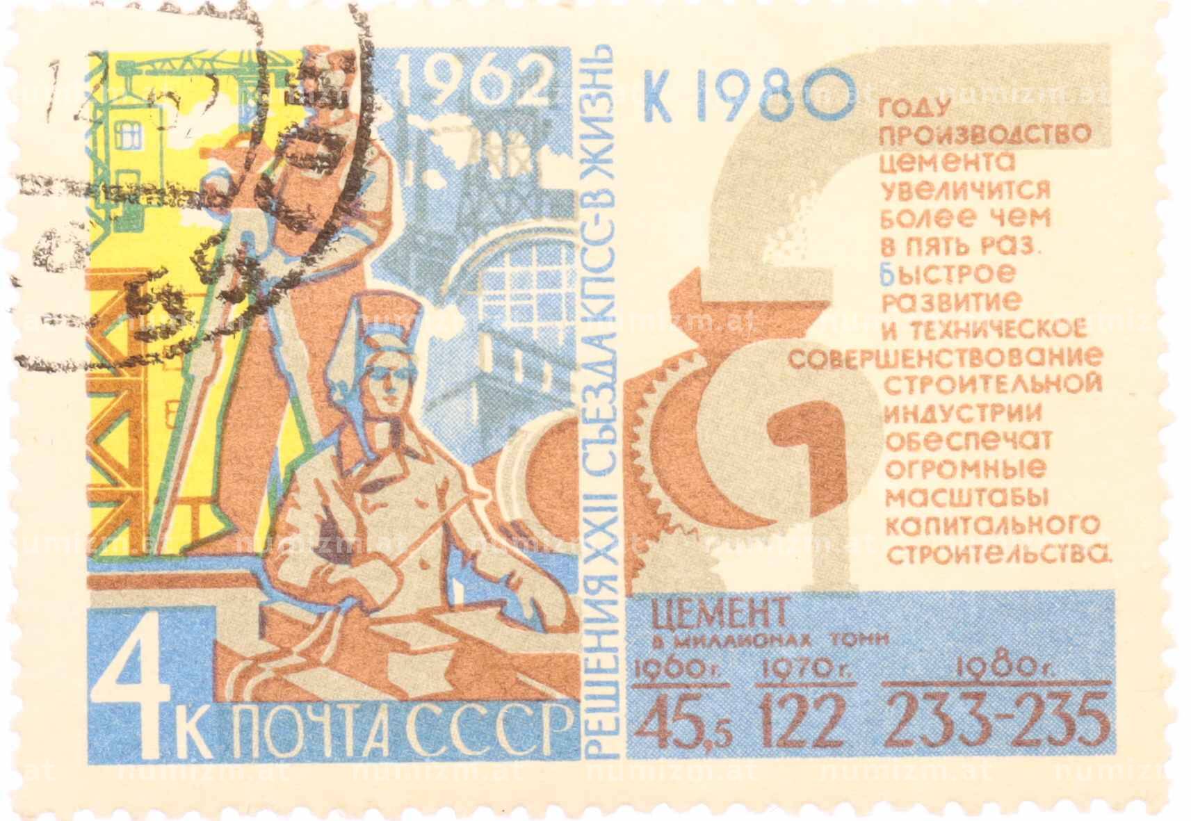 Купить Почтовая марка 4 копейки 1962 года «Решения XXII съезда КПСС — Цемент» по привлекательной цене можно в нашем интернет-магазине — Вам достаточно оформить заказ на сайте. Все монеты, представленные в каталоге, находятся в наличии на нашем складе.