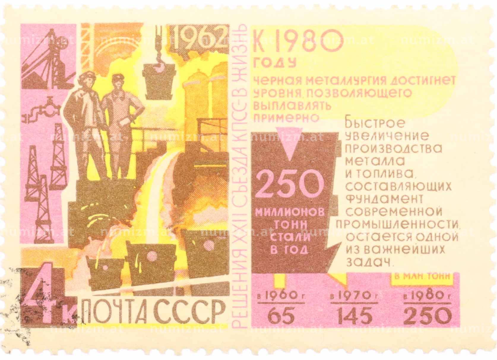 Купить Почтовая марка 4 копейки 1962 года «Решения XXII съезда КПСС — Черная металлургия» по привлекательной цене можно в нашем интернет-магазине — Вам достаточно оформить заказ на сайте. Все монеты, представленные в каталоге, находятся в наличии на нашем складе.