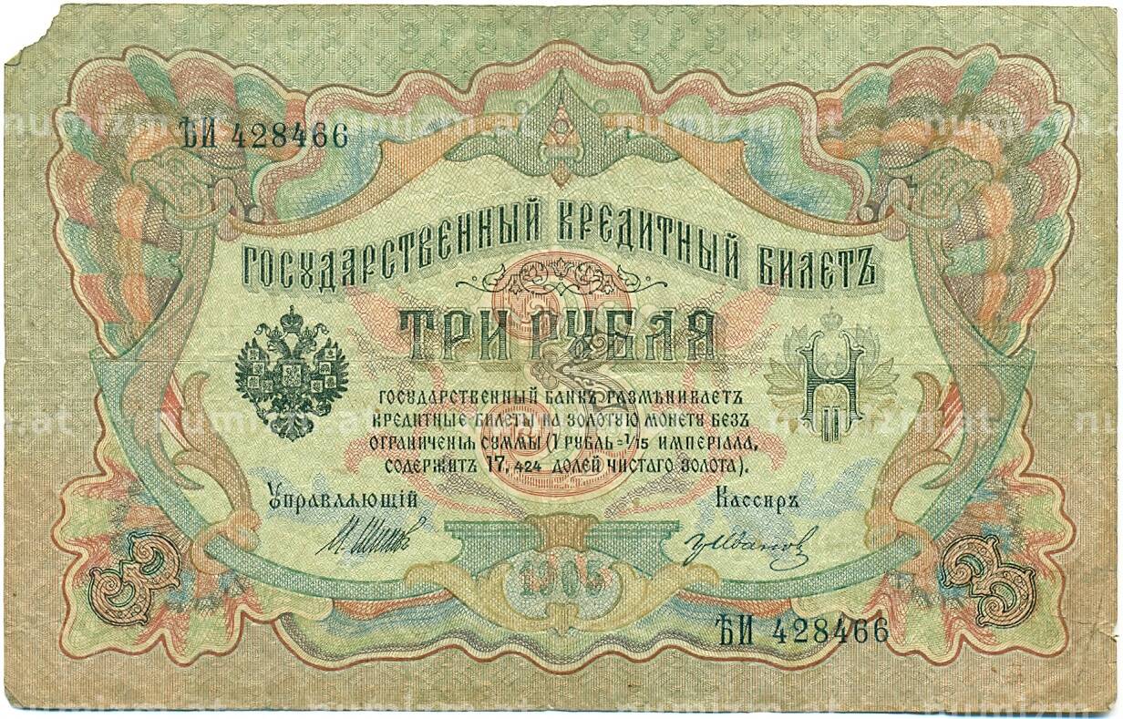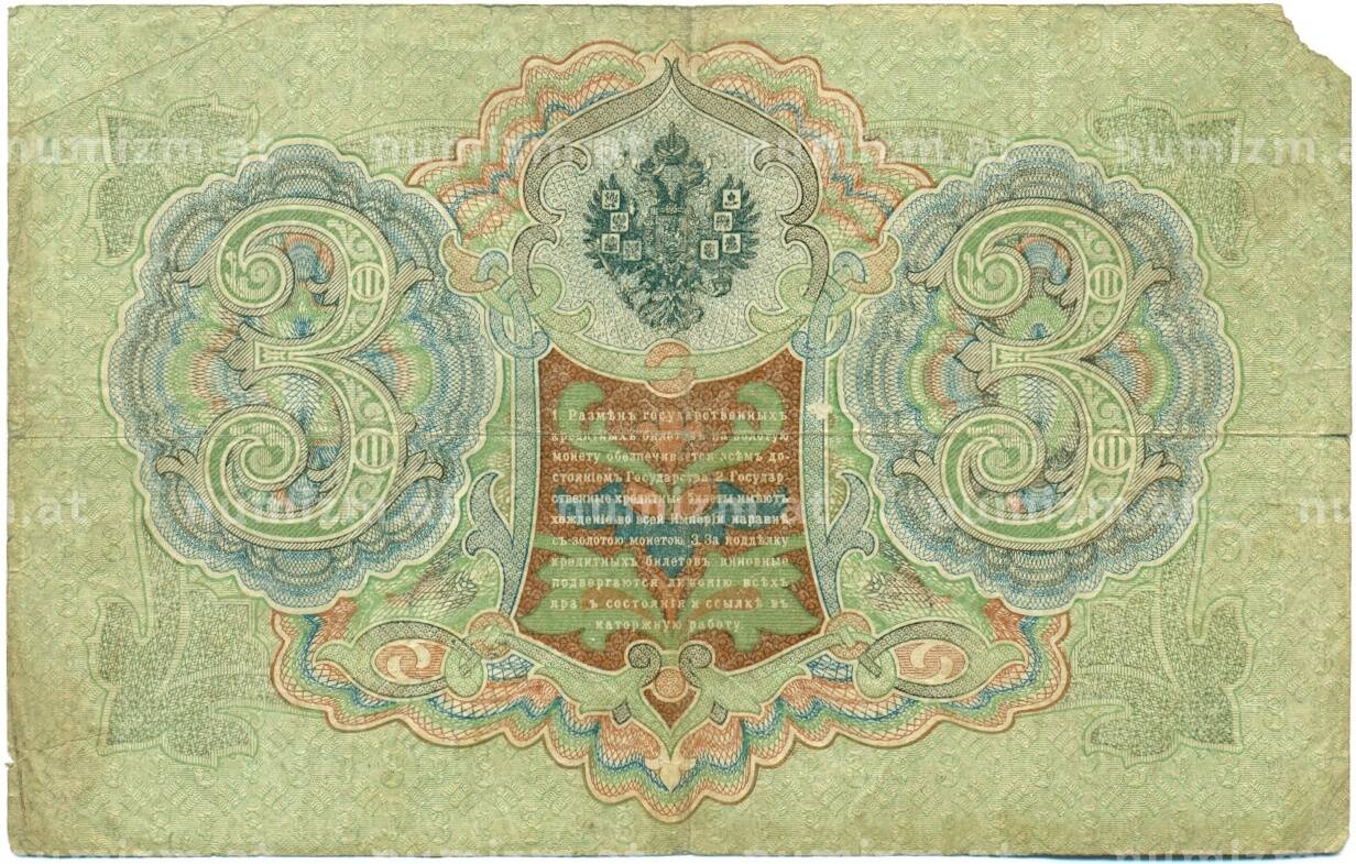 Банкнота 3 рубля 1905 года Шипов / Иванов (Артикул: K10-7766): подробные характеристики, качественные фотографии в высоком разрешении, низкая цена.