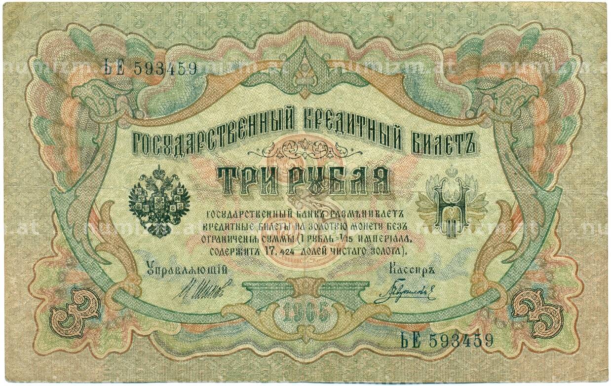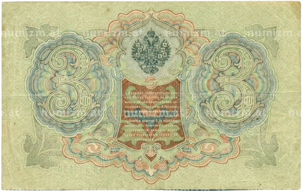 Банкнота 3 рубля 1905 года Шипов / Гаврилов (Артикул: K10-7838): подробные характеристики, качественные фотографии в высоком разрешении, низкая цена.